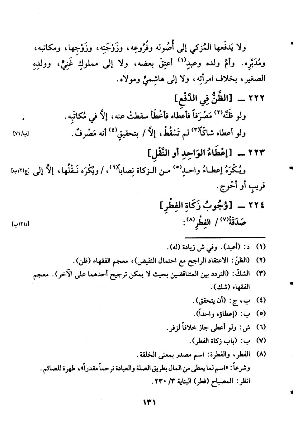 222 - الظَّن فِي الدّفع وَلَو ظَنّه مصرفاً فَأعْطَاهُ فَأَخْطَأَ سَقَطت عَنهُ إِلَّا فِي مكَاتبه وَلَو أعطَاهُ شاكاً لم تسْقط إِلَّا بتحقيق أَنه مصرف