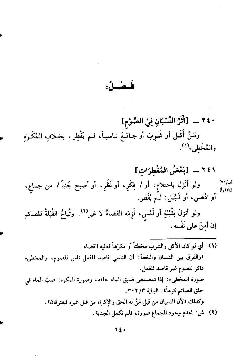 241 - بعض المفطرات وَلَو أنزل باحتلام أَو فكر أَو نظر أَو أصبح جنبا من جماع أَو ادهن أَو قبل لم يفْطر وَلَو أنزل بقبلة أَو لمس لزمَه الْقَضَاء لَا غير وتباح الْقبْلَة للصَّائِم إِن أَمن على نَفسه
