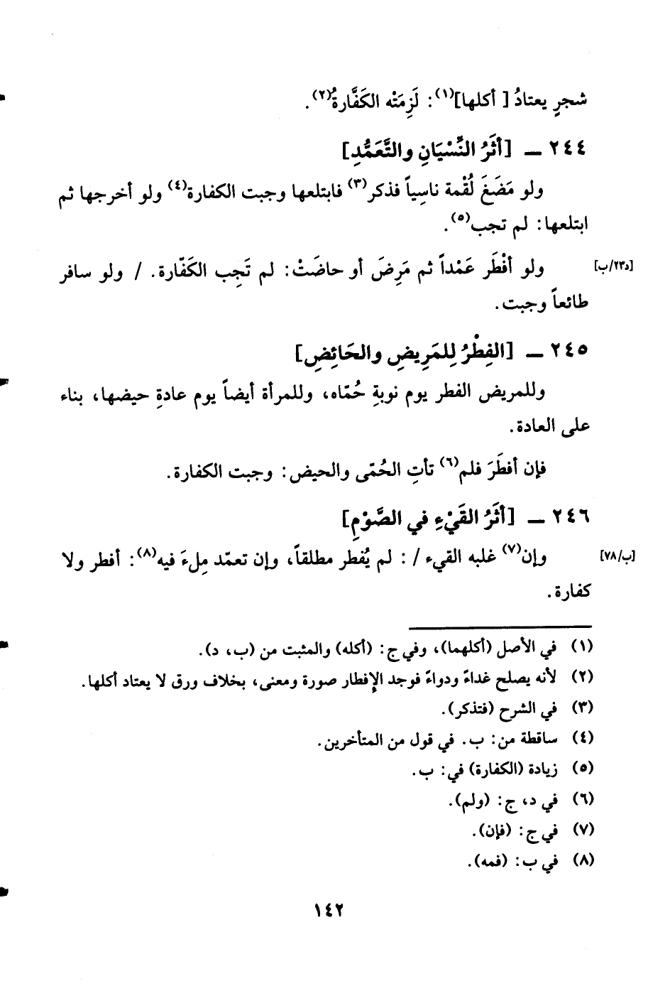 246 - أثر الْقَيْء فِي الصَّوْم وَإِن غَلبه الْقَيْء لم يفْطر مُطلقًا وَإِن تعمد ملْء فِيهِ أفطر وَلَا كَفَّارَة
