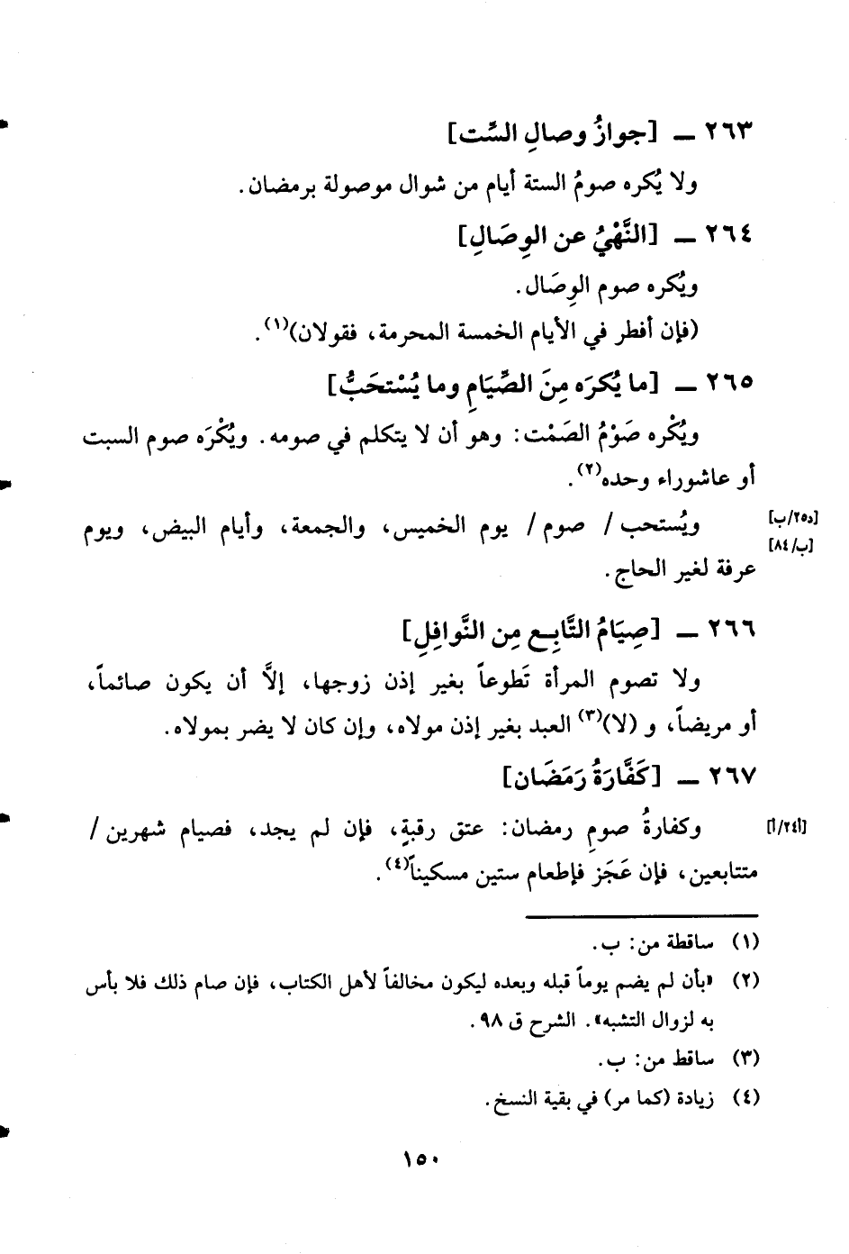 265 - مَا يكره من الصّيام وَمَا يسْتَحبّ وَيكرهُ صَوْم الصمت وَهُوَ أَن لَا يتَكَلَّم فِي صَوْمه وَيكرهُ صَوْم السبت أَو عَاشُورَاء وَحده وَيسْتَحب صَوْم يَوْم الْخَمِيس وَالْجُمُعَة وَأَيَّام الْبيض وَيَوْم عَرَفَة لغير الْحَاج