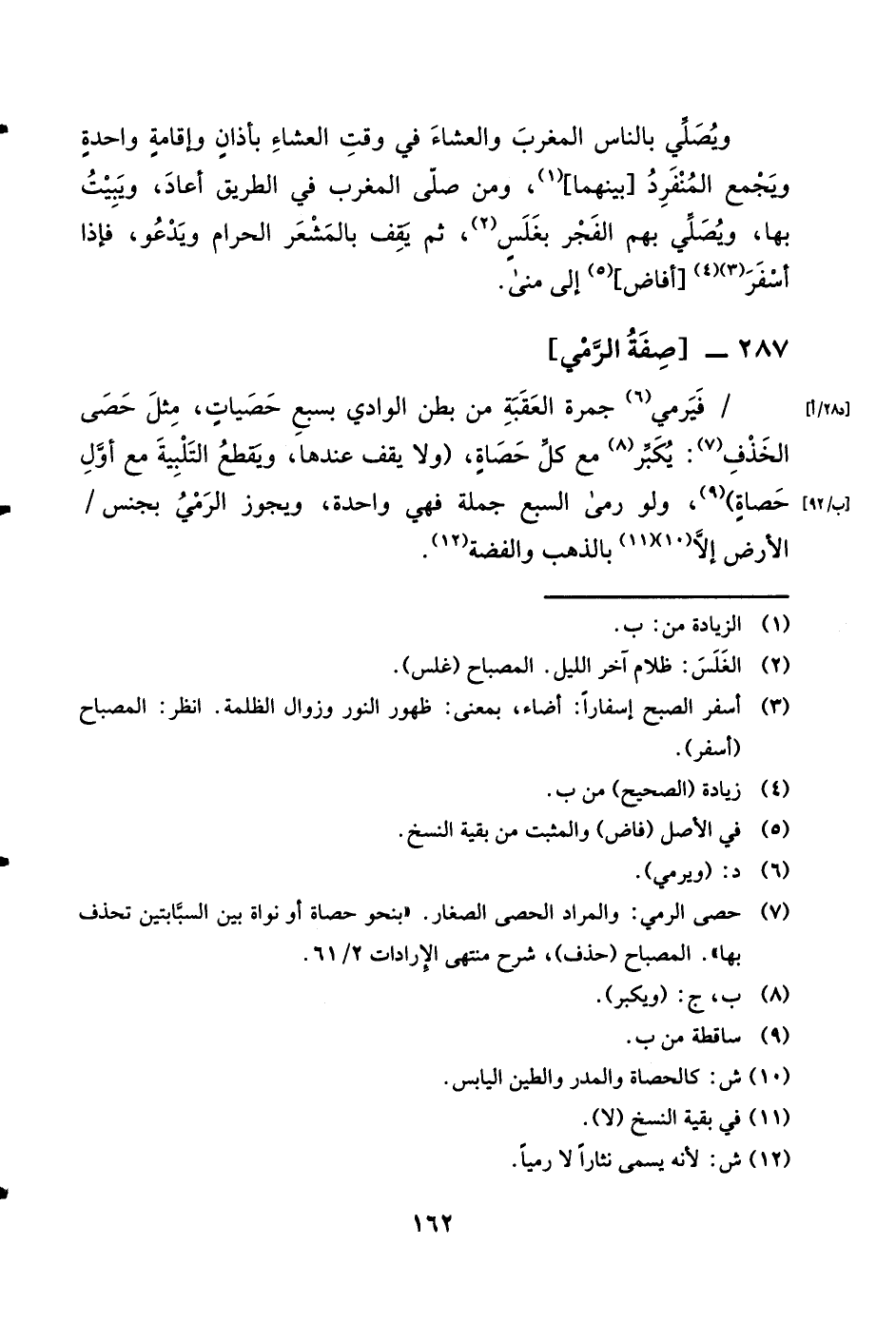 287 - صفة الرَّمْي فَيَرْمِي جَمْرَة الْعقبَة من بطن الْوَادي بِسبع حَصَيَات مثل حَصى الْخذف يكبر مَعَ كل حَصَاة وَلَا يقف عِنْدهَا وَيقطع التَّلْبِيَة مَعَ أول حَصَاة وَلَو رمى السَّبع جملَة فَهِيَ وَاحِدَة وَيجوز الرَّمْي بِجِنْس الأَرْض إِلَّا بِالذَّهَب وَالْفِضَّة