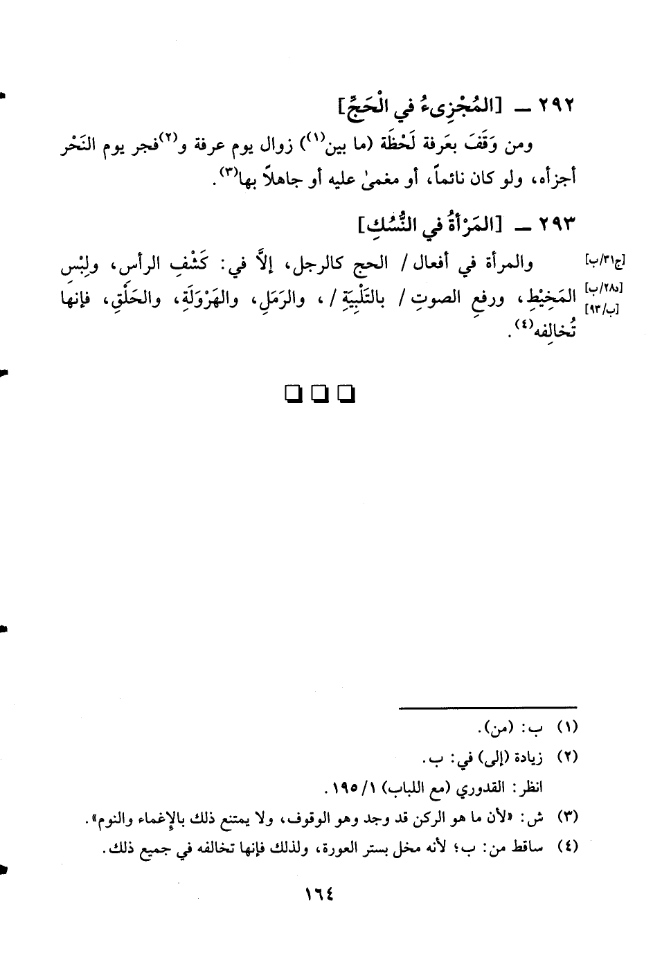 293 - الْمَرْأَة فِي النّسك وَالْمَرْأَة فِي أَفعَال الْحَج كَالرّجلِ إِلَّا فِي كشف الرَّأْس وَلبس الْمخيط وَرفع الصَّوْت بِالتَّلْبِيَةِ والرمل والهرولة وَالْحلق فَإِنَّهَا تخَالفه