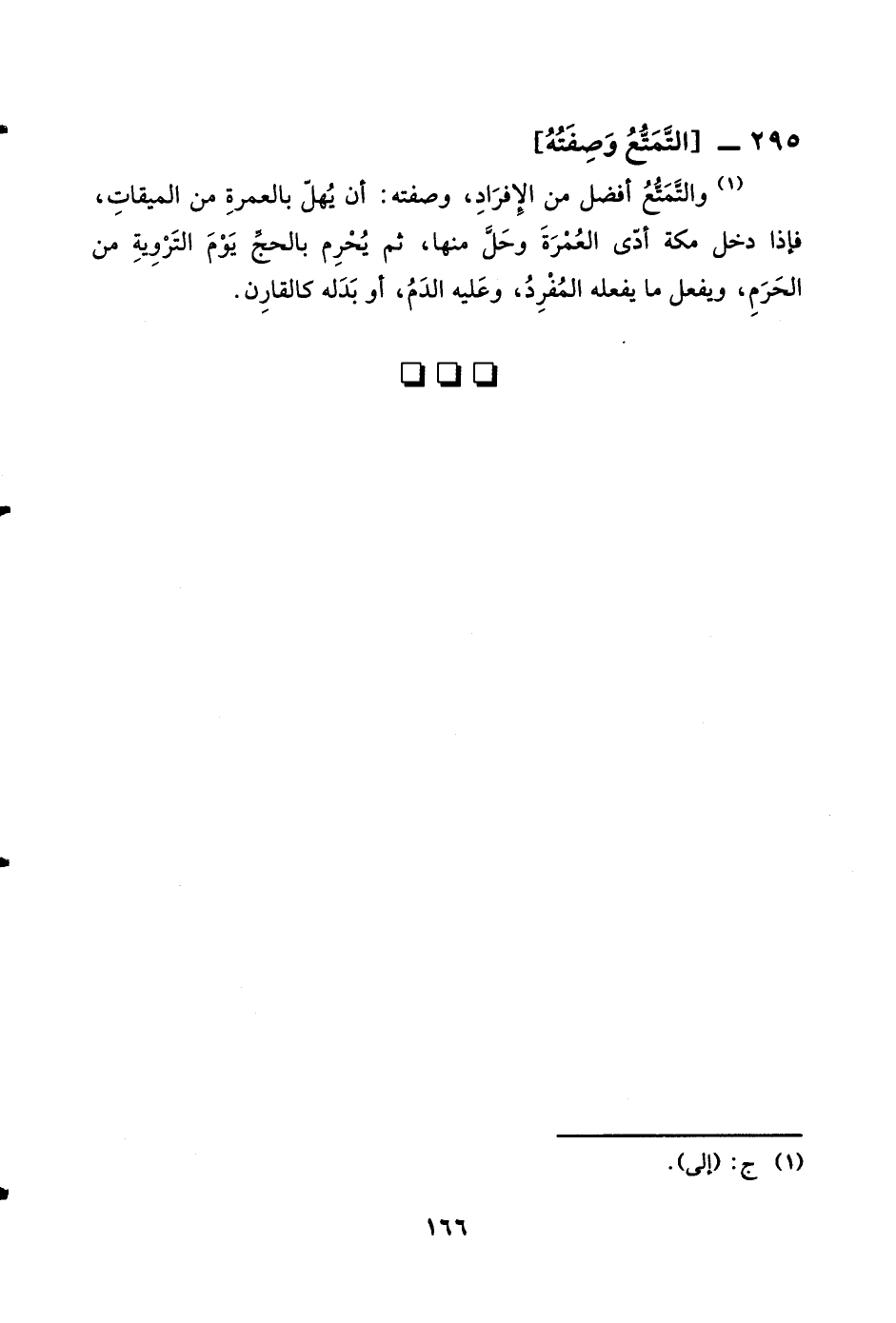 295 - التَّمَتُّع وَصفته والتمتع أفضل من الْإِفْرَاد وَصفته أَن يهل بِالْعُمْرَةِ من الْمِيقَات فَإِذا دخل مَكَّة أدّى الْعمرَة وَحل مِنْهَا ثمَّ يحرم بِالْحَجِّ يَوْم التَّرويَة من الْحرم وَيفْعل مَا يَفْعَله الْمُفْرد وَعَلِيهِ الدَّم أَو بدله كالقارن