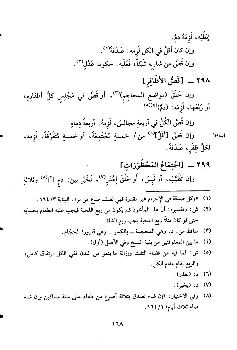 298 - قصّ الأظافر وَإِن حلق مَوَاضِع المحاجم أَو قصّ فِي مجْلِس كل أَظْفَاره أَو ربعهَا لزمَه دم وَإِن قصّ الْكل فِي أَرْبَعَة مجَالِس لزمَه أَرْبَعَة دِمَاء وَإِن قصّ أقل من خَمْسَة مجتمعةً أَو خَمْسَة مُتَفَرِّقَة لزمَه لكل ظفر صَدَقَة