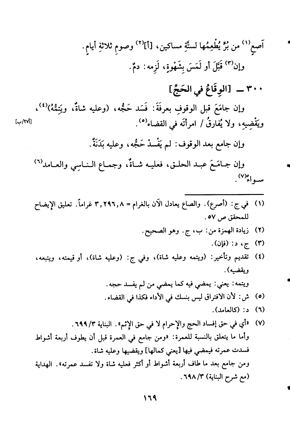 300 - الوقاع فِي الْحَج وَإِن جَامع قبل الْوُقُوف بِعَرَفَة فسد حجه وَعَلِيهِ شَاة ويتمه ويقضيه وَلَا يُفَارق امْرَأَته فِي الْقَضَاء وَإِن جَامع بعد الْوُقُوف لم يفْسد حجه وَعَلِيهِ بَدَنَة وَإِن جَامع عبد الْحلق فَعَلَيهِ شَاة وجماع النَّاسِي والعامد سَوَاء