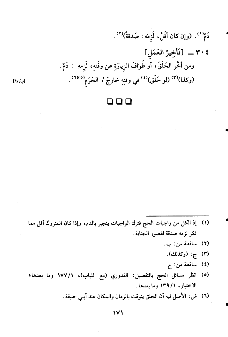 304 - تَأْخِير الْعَمَل وَمن أخر الْحلق أَو طواف الزِّيَارَة عَن وقته لزمَه دم وَكَذَا لَو حلق فِي وقته خَارج الْحرم