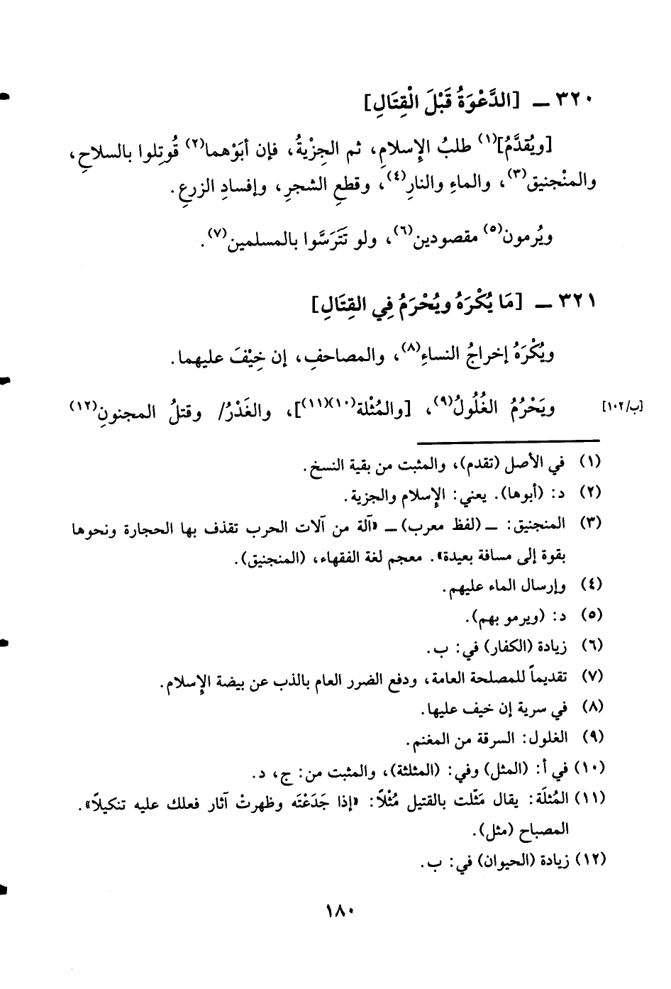 320 - الدعْوَة قبل الْقِتَال وَيقدم طلب الْإِسْلَام ثمَّ الْجِزْيَة فَإِن أَبوهُمَا قوتلوا بِالسِّلَاحِ والمنجنيق وَالْمَاء وَالنَّار وَقطع الشّجر وإفساد الزَّرْع ويرمون مقصودين وَلَو تترسوا بِالْمُسْلِمين