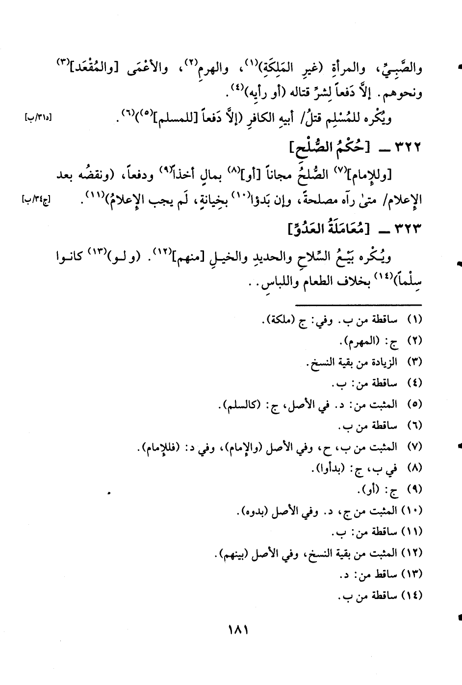 322 - حكم الصُّلْح وَللْإِمَام الصُّلْح مجَّانا أَو بِمَال أخذا ودفعاً ونقضه بعد الْإِعْلَام مَتى رَآهُ مصلحَة وَإِن بدؤا بخيانة لم يجب الْإِعْلَام