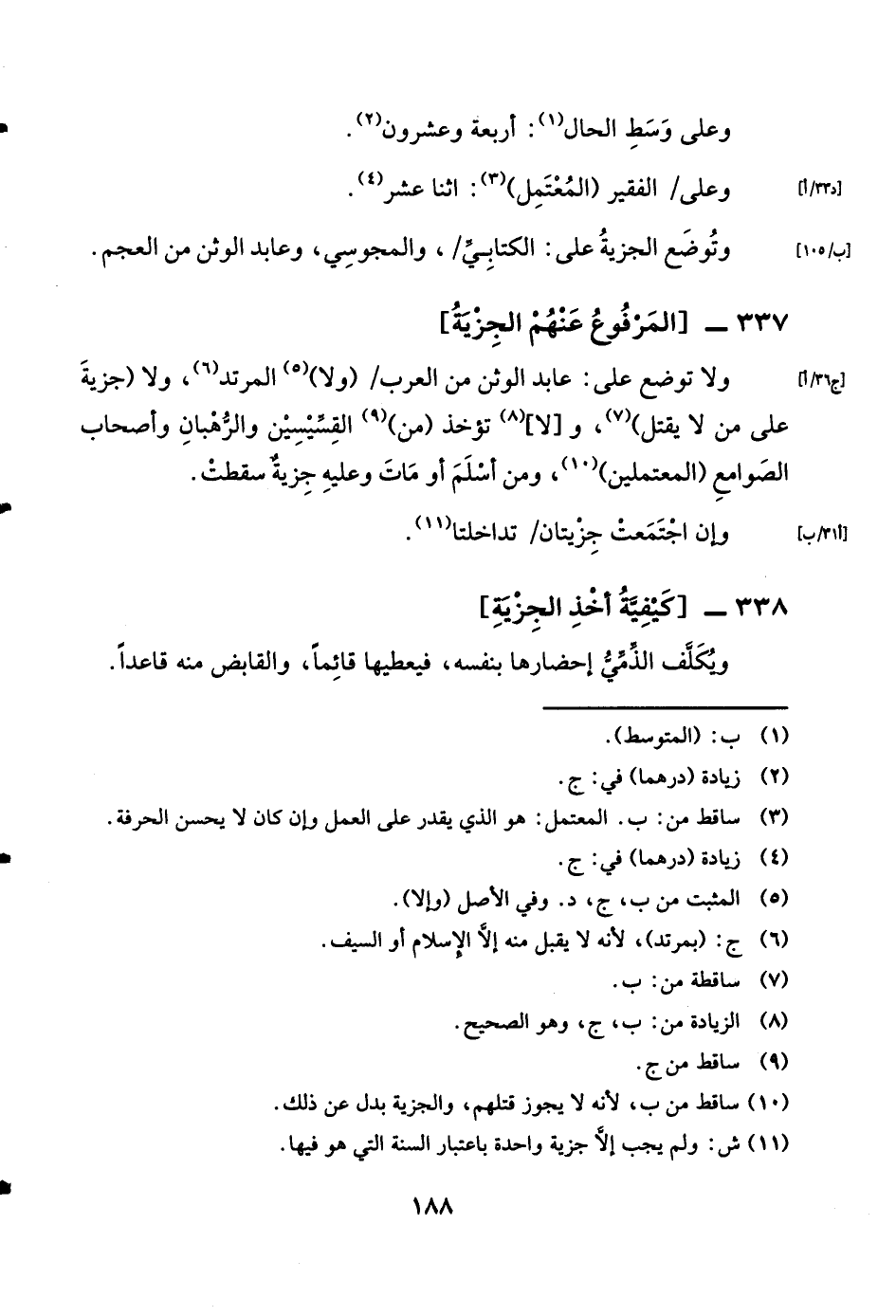 337 - الْمَرْفُوع عَنْهُم الْجِزْيَة وَلَا تُوضَع على عَابِد الوثن من الْعَرَب وَلَا الْمُرْتَد وَلَا جِزْيَة على من لَا يقتل وَلَا تُؤْخَذ من القسيسين والرهبان وَأَصْحَاب الصوامع المعتملين وَمن أسلم أَو مَاتَ وَعَلِيهِ جِزْيَة سَقَطت وَإِن اجْتمعت جزيتان تداخلتا