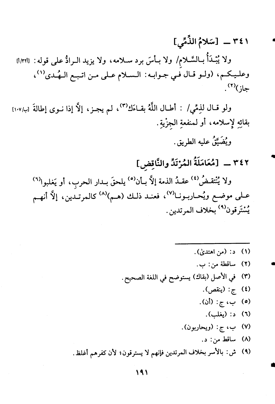 341 - سَلام الذِّمِّيّ وَلَا يبْدَأ بِالسَّلَامِ وَلَا بَأْس برد سَلَامه وَلَا يزِيد الرَّاد على قَوْله وَعَلَيْكُم وَلَو قَالَ فِي جَوَابه السَّلَام على من اتبع الْهدى جَازَ وَلَو قَالَ لذِمِّيّ أَطَالَ الله بَقَاءَك لم يجز إِلَّا إِذا نوى إطالة بَقَائِهِ لإسلامه أَو لمَنْفَعَة الْجِزْيَة ويضيق عَلَيْهِ الطَّرِيق