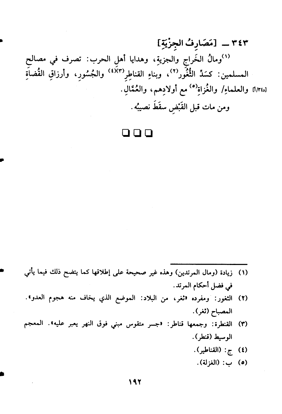 343 - مصارف الْجِزْيَة وَمَال الْخراج والجزية وهدايا أهل الْحَرْب تصرف فِي مصَالح الْمُسلمين كسد الثغور وَبِنَاء القناطر والجسور وأرزاق الْقُضَاة وَالْعُلَمَاء والغزاة مَعَ أَوْلَادهم والعمال وَمن مَاتَ قبل الْقَبْض سقط نصِيبه