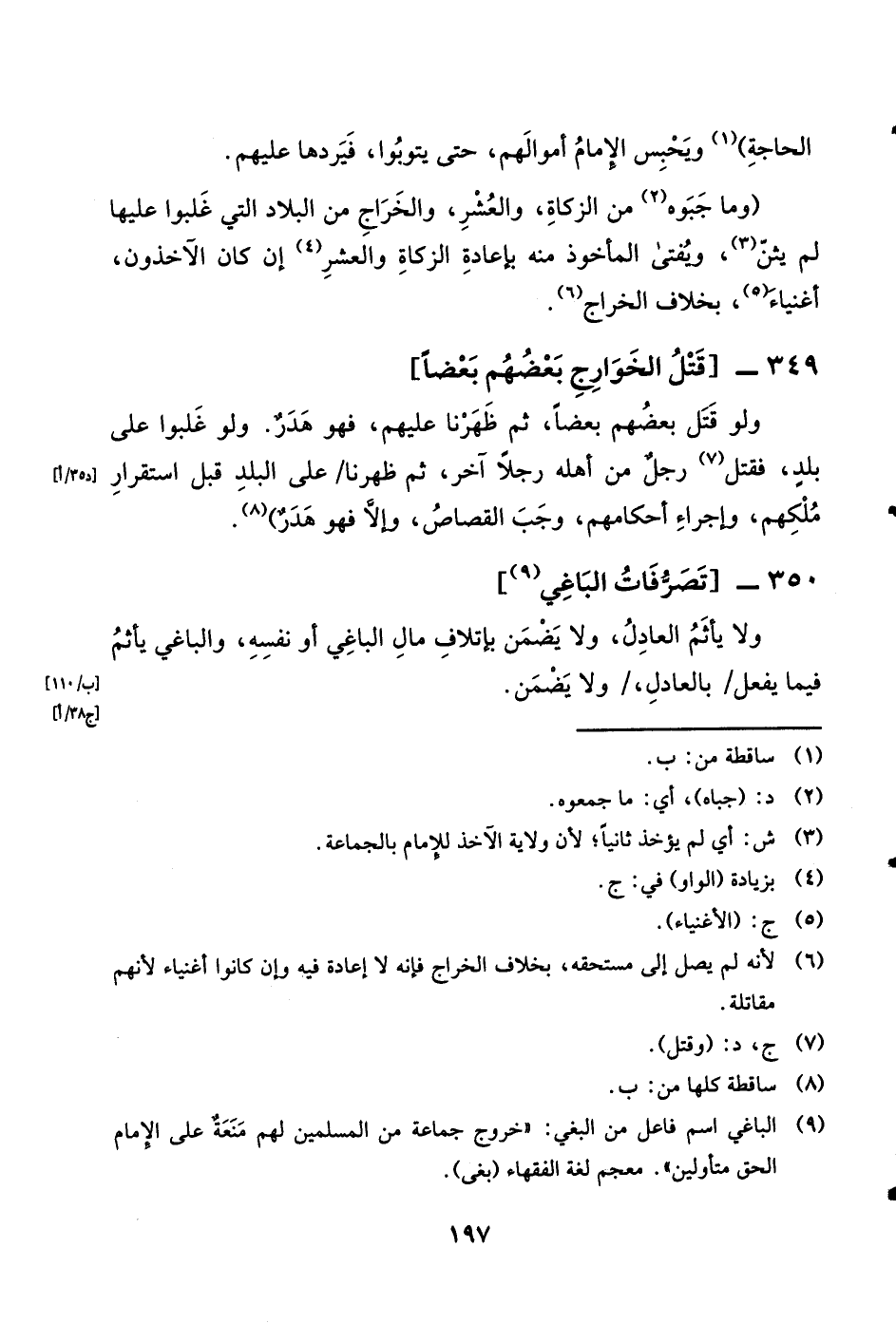 350 - تَصَرُّفَات الْبَاغِي وَلَا يَأْثَم الْعَادِل وَلَا يضمن بِإِتْلَاف مَال الْبَاغِي أَو نَفسه والباغي يَأْثَم فِيمَا يفعل بالعادل وَلَا يضمن