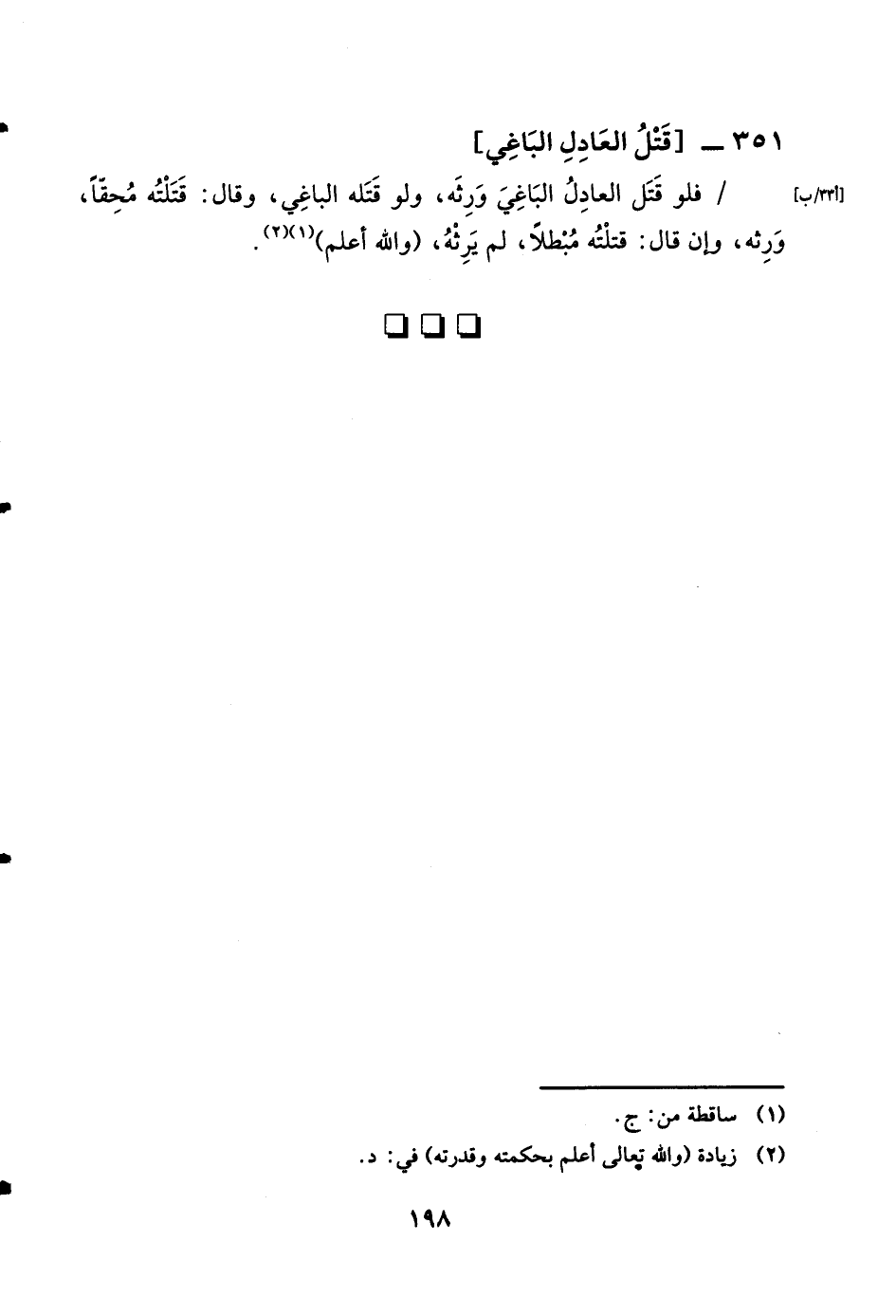 351 - قتل الْعَادِل الْبَاغِي فَلَو قتل الْعَادِل الْبَاغِي وَرثهُ وَلَو قَتله الْبَاغِي وَقَالَ قتلته محقاً وَرثهُ وَإِن قَالَ قتلته مُبْطلًا لم يَرِثهُ وَالله أعلم