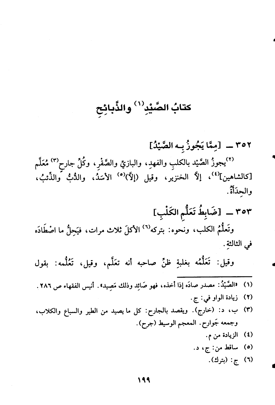 352 - مِمَّا يجوز بِهِ الصَّيْد يجوز الصَّيْد بالكلب والفهد والبازي والصقر وكل جارح معلم كالشاهين إِلَّا الْخِنْزِير وَقيل إِلَّا الْأسد والدب وَالذِّئْب والحدأة