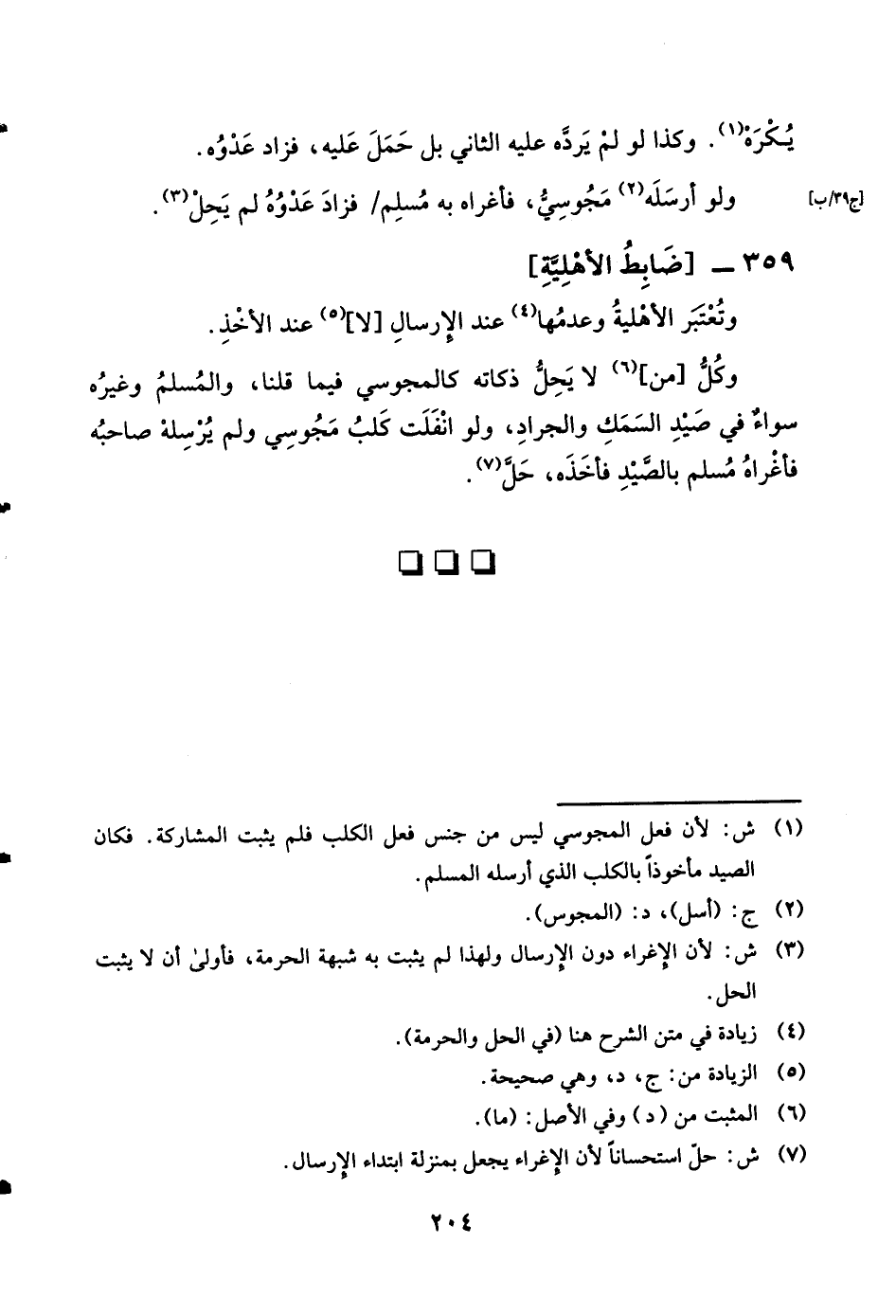 359 - ضَابِط الْأَهْلِيَّة وَتعْتَبر الْأَهْلِيَّة وَعدمهَا عِنْد الْإِرْسَال لَا عِنْد الْأَخْذ وكل من لَا يحل ذَكَاته كالمجوسي فِيمَا قُلْنَا وَالْمُسلم وَغَيره سَوَاء فِي صيد السّمك وَالْجَرَاد وَلَو انفلت كلب مَجُوسِيّ وَلم يُرْسِلهُ صَاحبه فأغراه مُسلم بالصيد فَأَخذه حل
