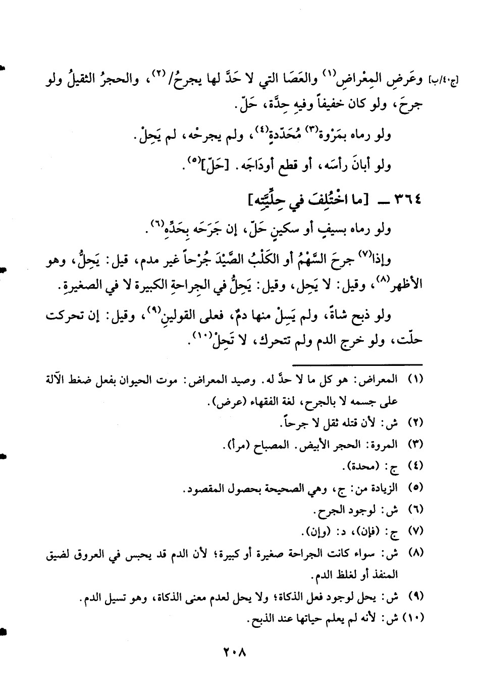 364 - مَا اخْتلف فِي حليته وَلَو رَمَاه بِسيف أَو سكين حل إِن جرحه بحده وَإِذا جرح السهْم أَو الْكَلْب الصَّيْد جرحا غير مدم قيل يحل وَهُوَ الْأَظْهر وَقيل لَا يحل وَقيل يحل فِي الْجراحَة الْكَبِيرَة لَا فِي الصَّغِيرَة وَلَو ذبح شَاة وَلم يسل مِنْهَا دم فعلى الْقَوْلَيْنِ وَقيل إِن تحركت حلت وَلَو خرج الدَّم وَلم تتحرك لَا تحل