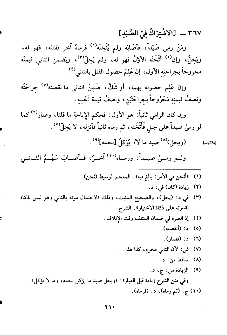 367 - الِاشْتِرَاك فِي الصَّيْد وَمن رمى صيدا فَأَصَابَهُ وَلم يثخنه فَرَمَاهُ آخر فَقتله فَهُوَ لَهُ وَيحل وَإِن أثخنه الأول فَهُوَ لَهُ وَلم يحل وَيضمن الثَّانِي قِيمَته مجروحاً بجراحته الأول إِن علم حُصُول الْقَتْل بِالثَّانِي وَإِن علم حُصُوله بهما أَو شكّ ضمن الثَّانِي مَا نقصته جراحته وَنصف قِيمَته مجروحاً بجراحتين وَنصف قيمَة لَحْمه وَإِن كَانَ الرَّامِي ثَانِيًا هُوَ الأول فَحكم الْإِبَاحَة مَا قُلْنَا وَصَارَ كَمَا لَو رمى صيدا على جبل فأثخنه ثمَّ رَمَاه ثَانِيًا فأنزله لَا يحل وَيحل صيد مَا لَا يُؤْكَل لَحْمه وَلَو رمى صيدا ورماه آخر فَأصَاب سهم الثَّانِي