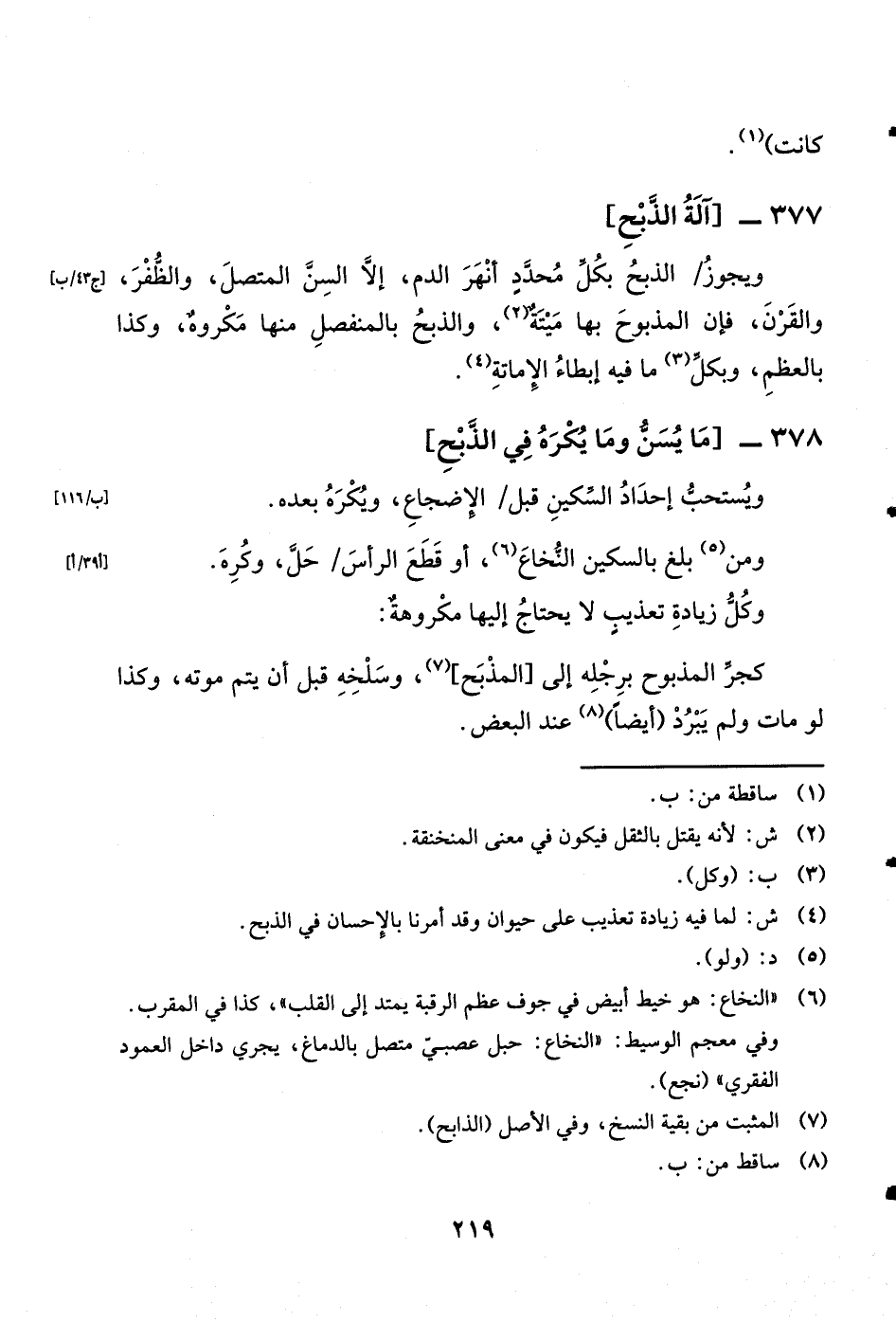 377 - آله الذّبْح وَيجوز الذّبْح بِكُل محدد أنهر الدَّم إِلَّا السن الْمُتَّصِل وَالظفر والقرن فَإِن الْمَذْبُوح بهَا ميتَة وَالذّبْح بالمنفصل مِنْهَا مَكْرُوه وَكَذَا بالعظم وَبِكُل مَا فِيهِ إبطاء الإماتة