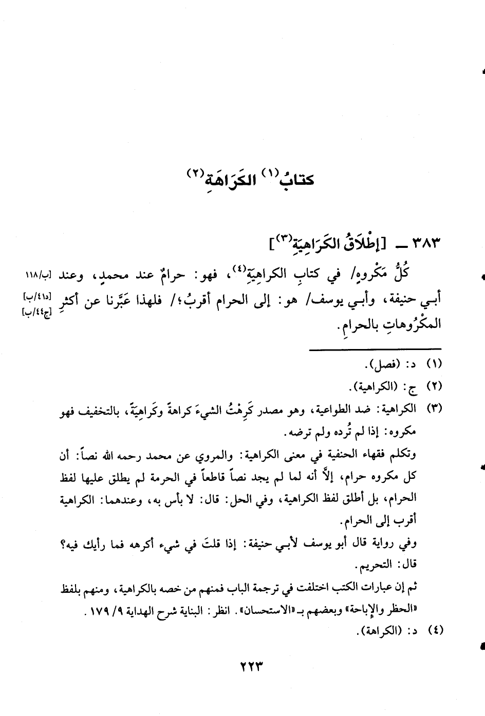 383 - إِطْلَاق الْكَرَاهِيَة كل مَكْرُوه فِي كتاب الْكَرَاهِيَة فَهُوَ حرَام عِنْد مُحَمَّد وَعند أبي حنيفَة وَأبي يُوسُف هُوَ إِلَى الْحَرَام أقرب فَلهَذَا عبرنا عَن أَكثر المكروهات بالحرام