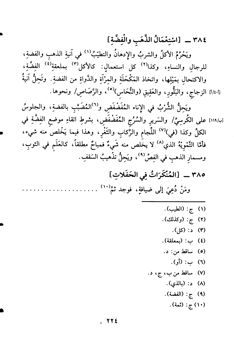 384 - اسْتِعْمَال الذَّهَب وَالْفِضَّة وَيحرم الْأكل وَالشرب والإدهان والتطيب فِي آنِية الذَّهَب وَالْفِضَّة للرِّجَال وَالنِّسَاء وَكَذَا كل اسْتِعْمَال كَالْأَكْلِ بملعقة الْفضة والاكتحال بميلها واتخاذ المكحلة والمرآة والدواة من الْفضة وَتحل آنِية الزّجاج والبلور والعقيق والنحاس والرصاص وَنَحْوهَا وَيحل الشّرْب فِي الْإِنَاء المفضفض والمضبب بِالْفِضَّةِ وَالْجُلُوس على الْكُرْسِيّ والسرير والسرج المفضفض بِشَرْط اتقاء مَوضِع الْفضة فِي الْكل وَكَذَا فِي اللجام والركاب والثغر وَهَذَا فِيمَا يخلص مِنْهُ شَيْء فَأَما التمويه الَّذِي لَا يخلص مِنْهُ شَيْء فمباح مُطلقًا كَالْعلمِ فِي الثَّوْب ومسمار الذَّهَب فِي الفص وَيحل تذهيب السّقف