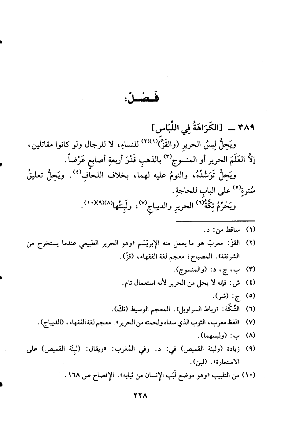 389 - الْكَرَاهَة فِي اللبَاس وَيحل لبس الْحَرِير والقز للنِّسَاء لَا للرِّجَال وَلَو كَانُوا مقاتلين إِلَّا الْعلم الْحَرِير أَو المنسوج بِالذَّهَب قدر أَرْبَعَة أَصَابِع عرضا وَيحل توسده وَالنَّوْم عَلَيْهِ لَهما بِخِلَاف اللحاف وَيحل تَعْلِيق ستْرَة على الْبَاب للْحَاجة وَيحرم تكة الْحَرِير والديباج ولبنتها