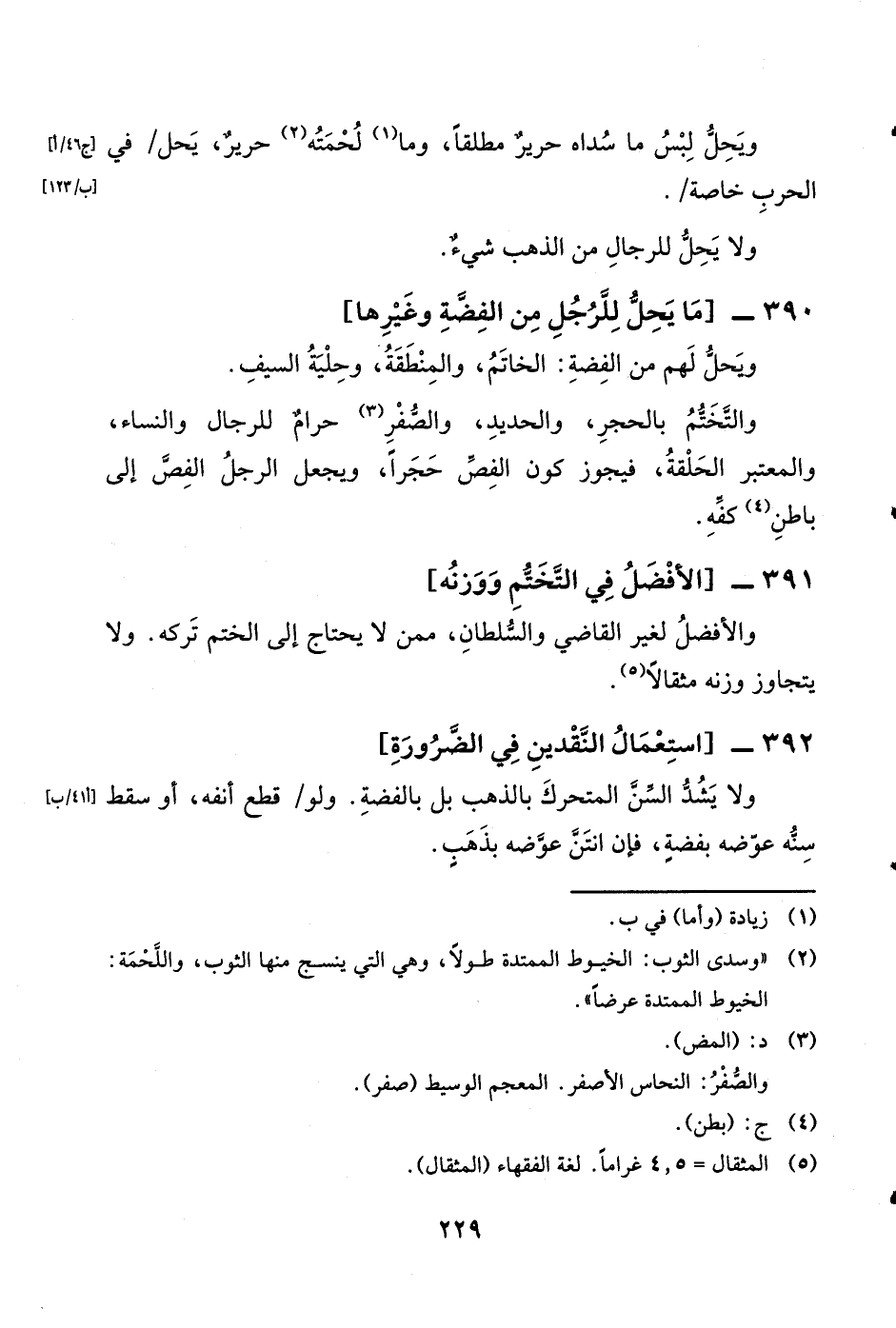 390 - مَا يحل للرجل من الْفضة وَغَيرهَا وَيحل لَهُم من الْفضة الْخَاتم والمنطقة وَحلية السَّيْف والتختم بِالْحجرِ وَالْحَدِيد والصفر حرَام للرِّجَال وَالنِّسَاء وَالْمُعْتَبر الْحلقَة فَيجوز كَون الفص حجرا وَيجْعَل الرجل الفص إِلَى بَاطِن كَفه
