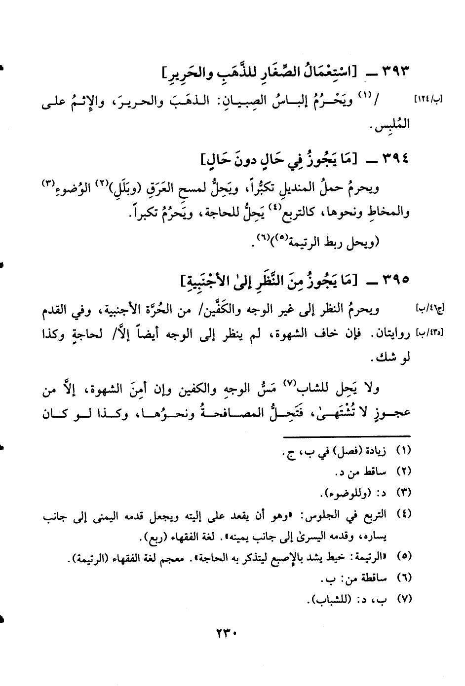 394 - مَا يجوز فِي حَال دون حَال وَيحرم حمل المنديل تكبراً وَيحل لمسح الْعرق وبلل الْوضُوء والمخاط وَنَحْوهَا كالتربع يحل للْحَاجة وَيحرم تكبراً وَيحل ربط الرتيمة