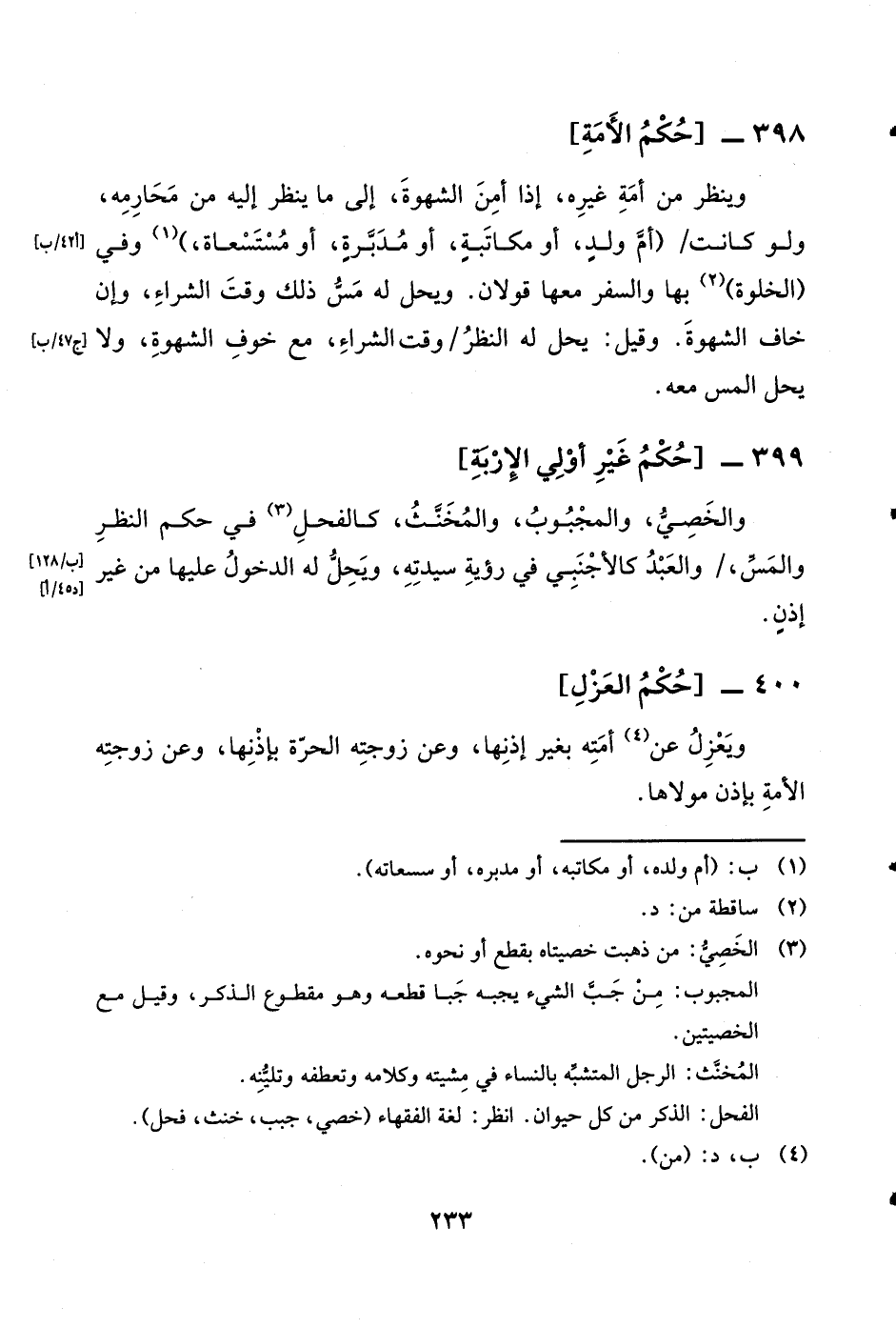 399 - حكم غير أولي الإربة والخصي والمجبوب والمخنث كالفحل فِي حكم النّظر والمس وَالْعَبْد كَالْأَجْنَبِيِّ فِي رُؤْيَة سيدته وَيحل لَهُ الدُّخُول عَلَيْهَا من غير إِذن