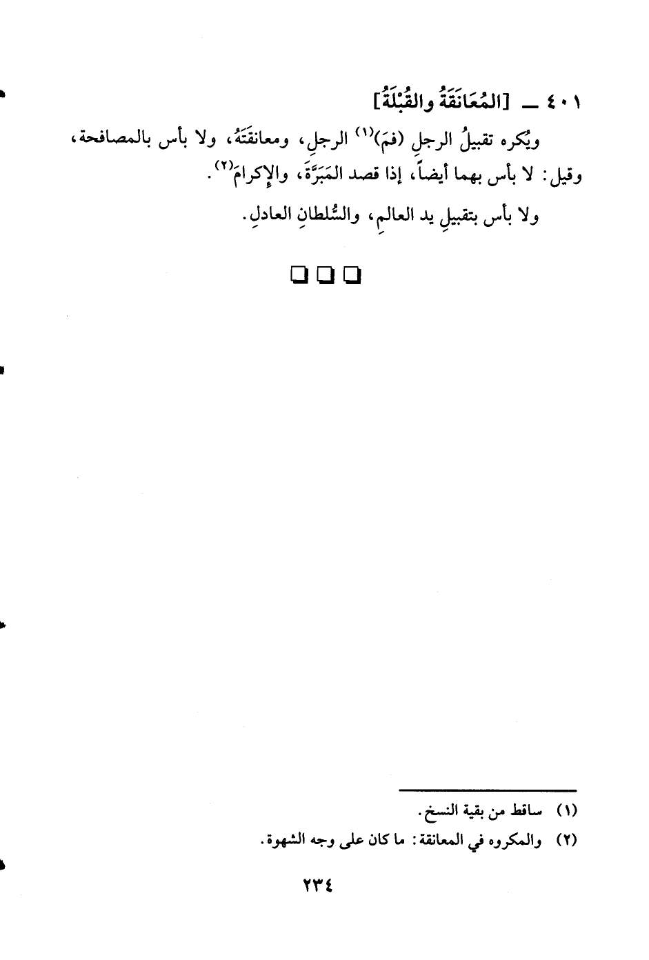 401 - المعانقة والقبلة وَيكرهُ تَقْبِيل الرجل فَم الرجل ومعانقته وَلَا بَأْس بالمصافحة وَقيل لَا بَأْس بهما أَيْضا إِذا قصد المبرة وَالْإِكْرَام وَلَا بَأْس بتقبيل يَد الْعَالم وَالسُّلْطَان الْعَادِل