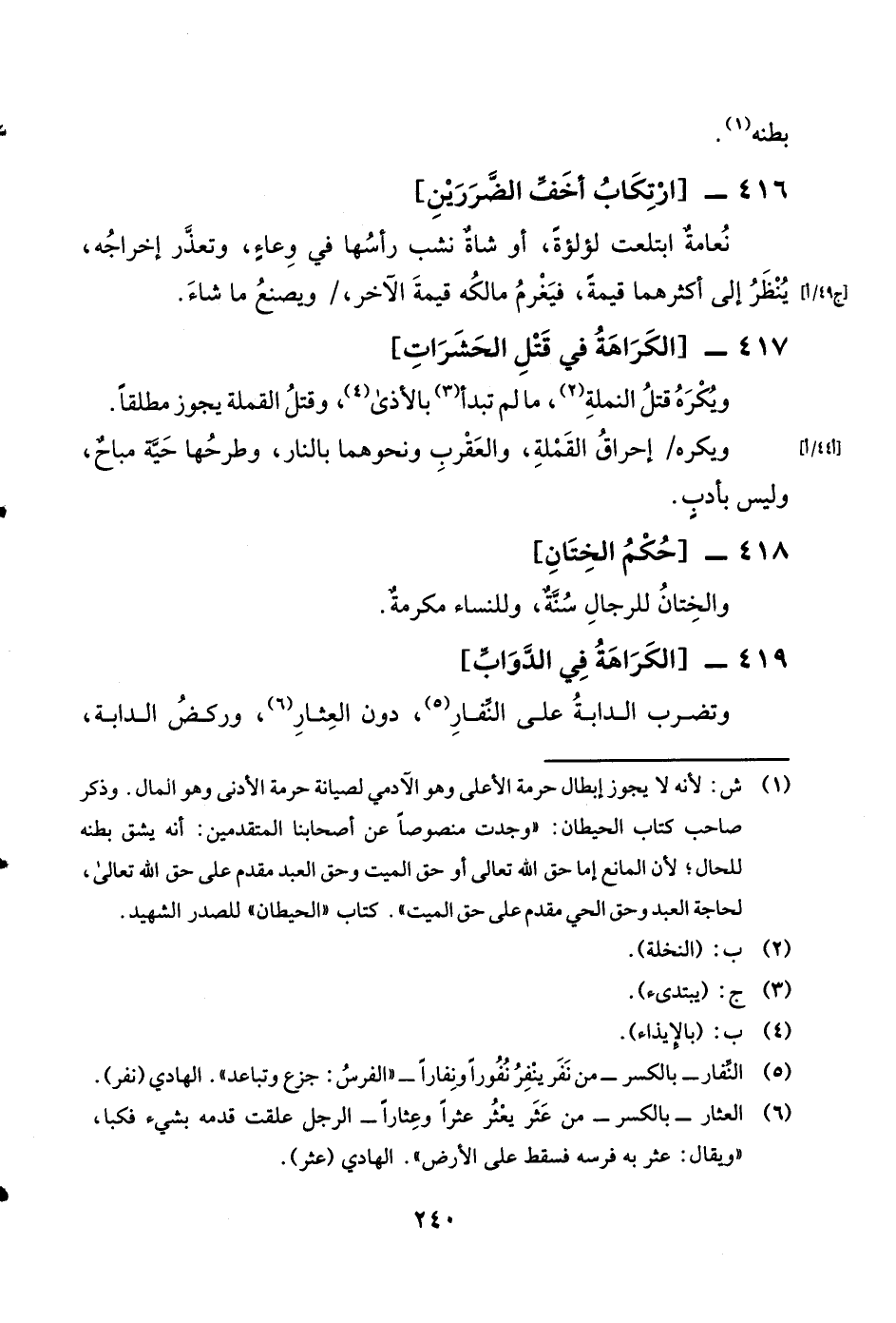 417 - الْكَرَاهَة فِي قتل الحشرات وَيكرهُ قتل النملة مَا لم تبدأ بالأذى وَقتل القملة يجوز مُطلقًا وَيكرهُ إحراق القملة وَالْعَقْرَب وَنَحْوهمَا بالنَّار وطرحها حَيَّة مُبَاح وَلَيْسَ بأدب