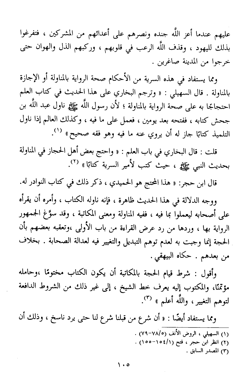 ومما يستفاد في هذه السرية من الأحكام صحة الرواية بالمناولة أو الإجازة بالمناولة. قال السهيلي: "وترجم البخاري على هذا الحديث في كتاب العلم احتجاجا به على صحة الرواية بالمناولة، لأن رسول الله صلى الله عليه وسلم ناول عبد الله بن جحش كتابه، ففتحه بعد يومين، فعمل على ما فيه، وكذلك العالم إذا ناول التلميذ كتابا جاز له أن يروي عنه ما فيه وهو فقه صحيح"1.