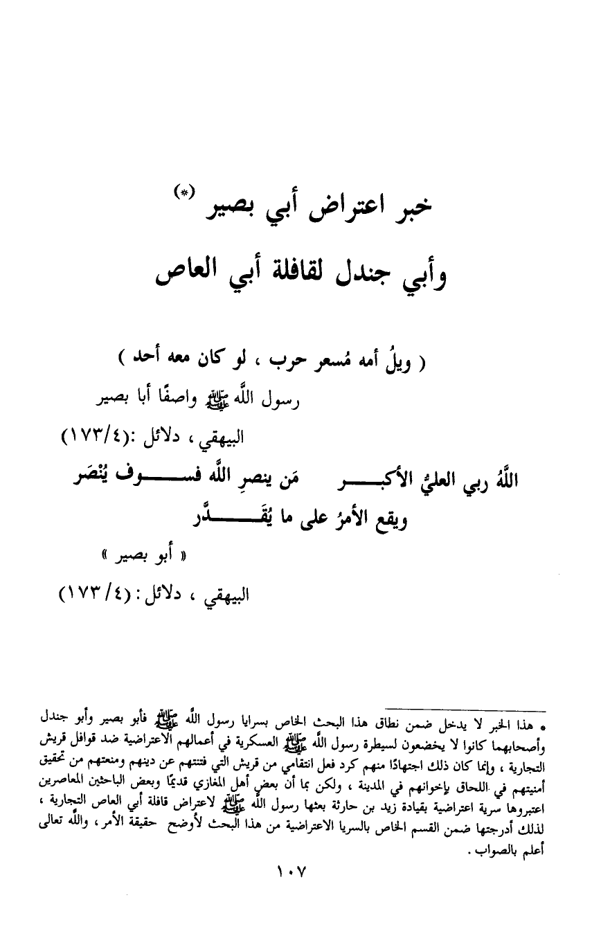1 هذا الخبر لا يدخل ضمن نطاق هذا البحث الخاص بسرايا رسول الله صلى الله عليه وسلم فأبو بصير وأبو جندل وأصحابهما كانوا لا يخضعون لسيطرة رسول الله صلى الله عليه وسلم العسكرية في أعمالهم الاعتراضية ضد قوافل قريش التجارية، وإنما كان ذلك اجتهادا منهم كرد فعل انتقامي من قريش التي فتنتهم عن دينهم ومنعتهم من تحقيق أمنيتهم في اللحاق بإخوانهم في المدينة، ولكن بما أن بعض أهل المغازي قديما وبعض الباحثين المعاصرين اعتبروها سرية اعتراضية بقيادة زيد بن حارثة بعثها رسول الله صلى الله عليه وسلم لاعتراض قافلة أبي العاص التجارية، لذلك أدرجتها ضمن القسم الخاص بالسرايا الاعتراضية من هذا البحث لأوضح حقيقة الأمر، والله تعالى أعلم بالصواب.
