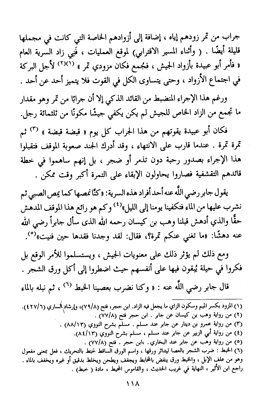 يقول جابر رضي الله عنه أحد أفراد هذه السرية: "كنَّا نمصها كما يمص الصبي ثم نشرب عليها الماء فتكفينا يومنا إلى الليل"4 وكم هو رائع هذا الموقف المدهش حقّا والذي أدهش قبلنا وهب بن كيسان رحمه الله الذي سأل جابرا رضي الله عنه دهشًا: "ما تغني عنكم تمرة؟، فقال: لقد وجدنا فقدها حين فنيت"5.