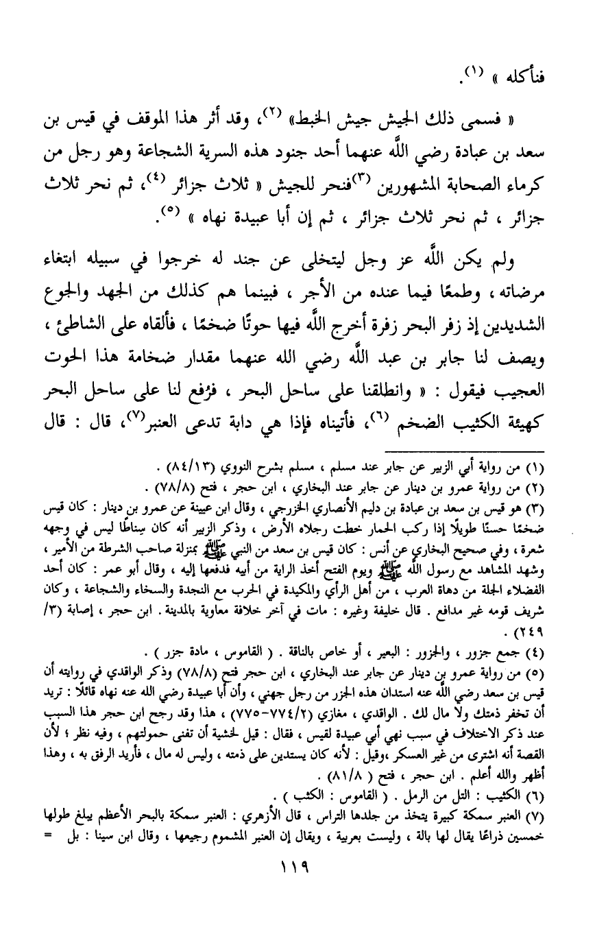 5 من رواية عمروبن دينار عن جابر عند البخاري، ابن حجر فتح (8/78) وذكر الواقدي في روايته أن قيس بن سعد رضي الله عنه استدان هذه الجزر من رجل جهني، وأن أبا عبيدة رضي الله عنه نهاه قائلا: تريد أن تخفر ذمتك ولا مال لك. الواقدي، مغازي (2/774-775) ، هذا وقد رجح ابن حجر هذا السبب عند ذكر الاختلاف في سبب نهي أبي عبيدة لقيس، فقال: قيل لخشية أن تفنى حمولتهم، وفيه نظر؛ لأن القصة أنه اشترى من غير العسكر، وقيل: لأنه كان يستدين على ذمته، وليس له مال، فأريد الرفق به، وهذا أظهر والله أعلم، فتح (8/81) .