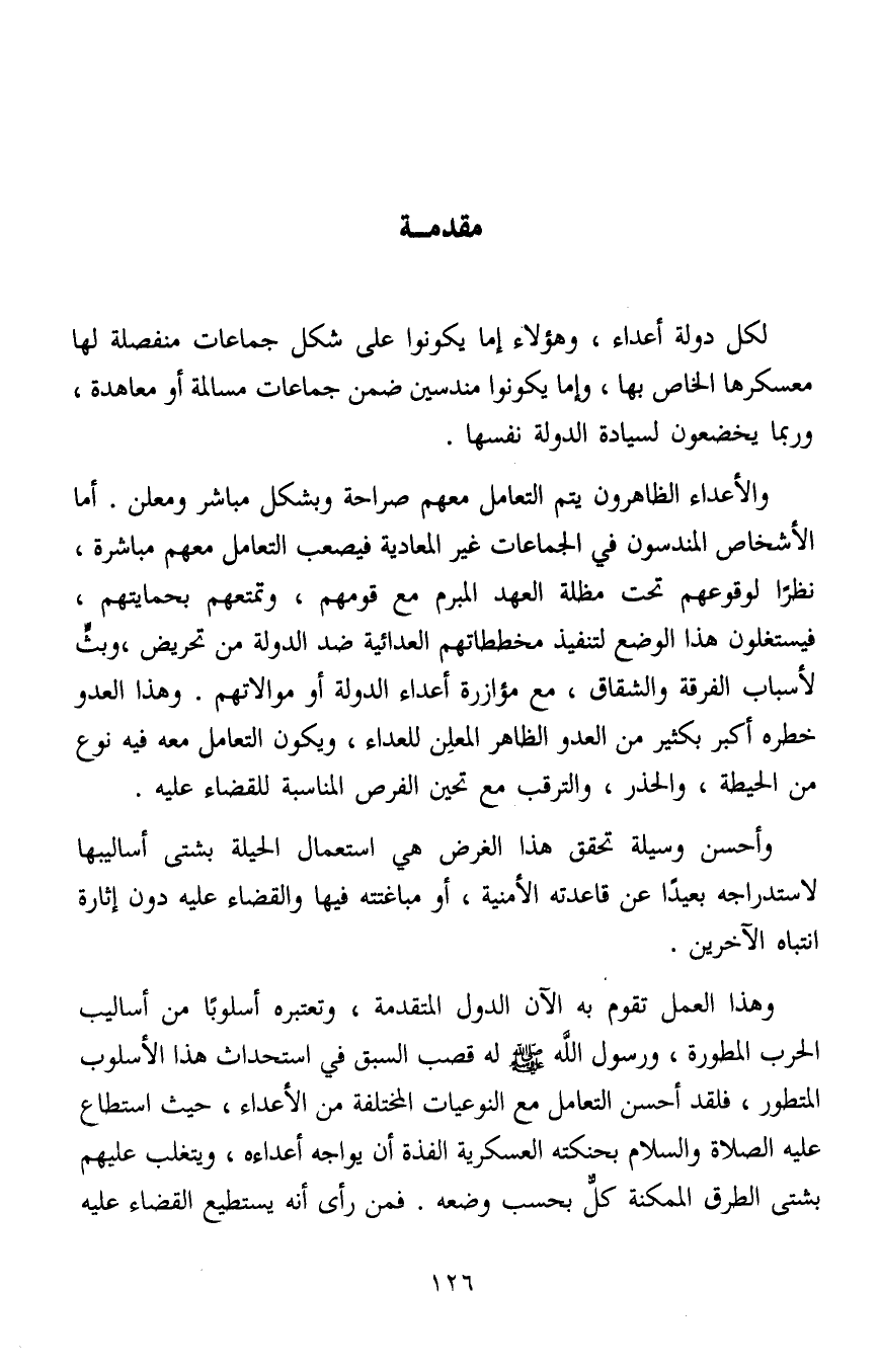 وهذا العمل تقوم به الآن الدول المتقدمة، وتعتبره أسلوبا من أساليب الحرب المطورة، ورسول الله صلى الله عليه وسلم له قصب السبق في استحداث هذا الأسلوب المتطور، فقد أحسن التعامل مع التوعيات المختلفة مع الأعداء، حيث استطاع عليه الصلاة والسلام بحنكته العسكرية الفذة أن يواجه أعداءه، ويتغلب عليهم بشتى الطرق الممكنة كلٌّ بحسب وضعه. فمن رأى أنه يستطيع القضاء عليه