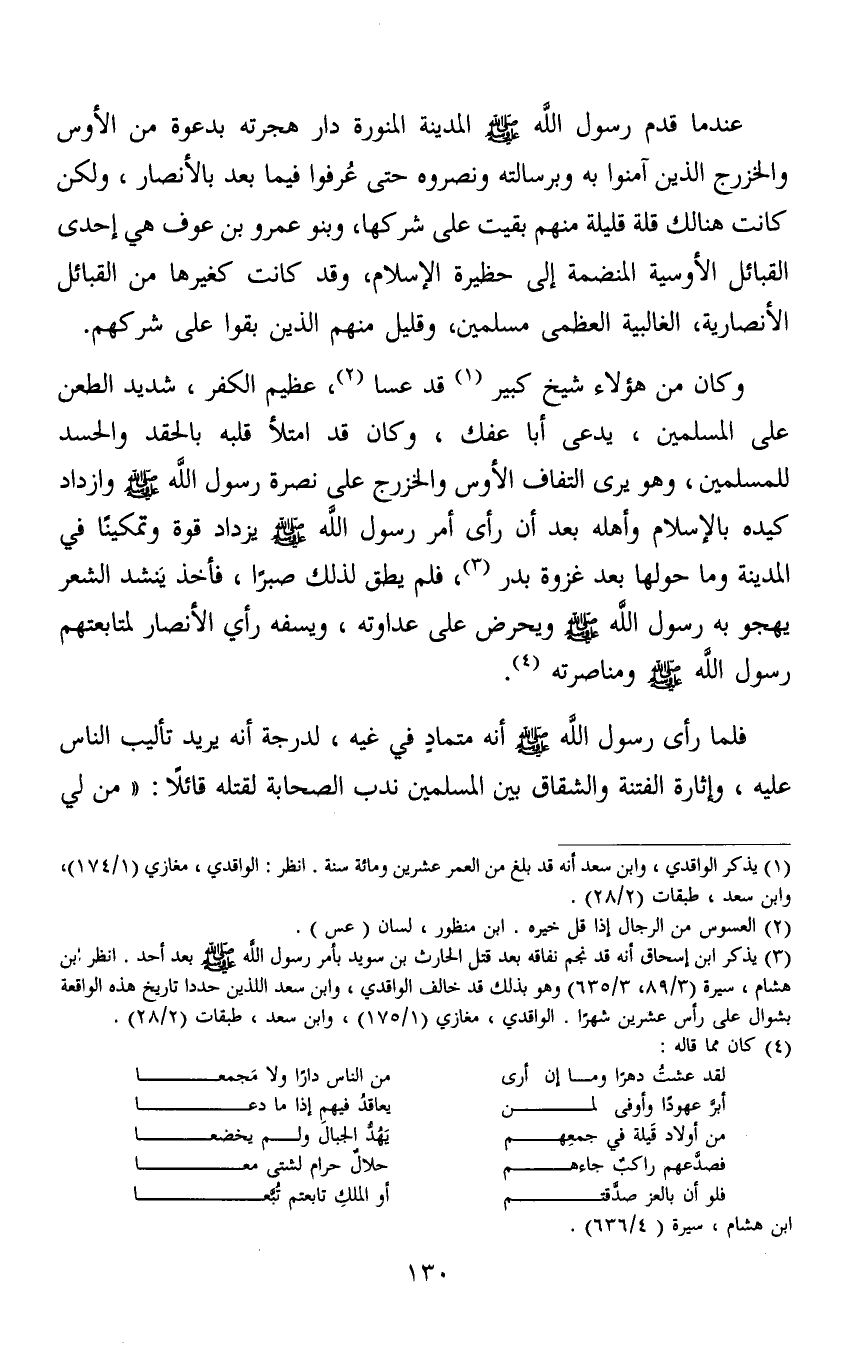 3 يذكر ابن إسحاق أنه قد نجم نفاقه بعد قتل الحارث بن سويد بأمر رسول الله صلى الله عليه وسلم بعد أحد. انظر ابن هشام، سيرة (3/89، 3/635) وهو بذلك قد خالف الواقدي، وابن سعد اللذين حددا تاريخ هذه الواقعة بشوال على رأس عشرين شهرا. الواقدي، مغازي (1/175) ، وابن سعد، طبقات (2/28) .