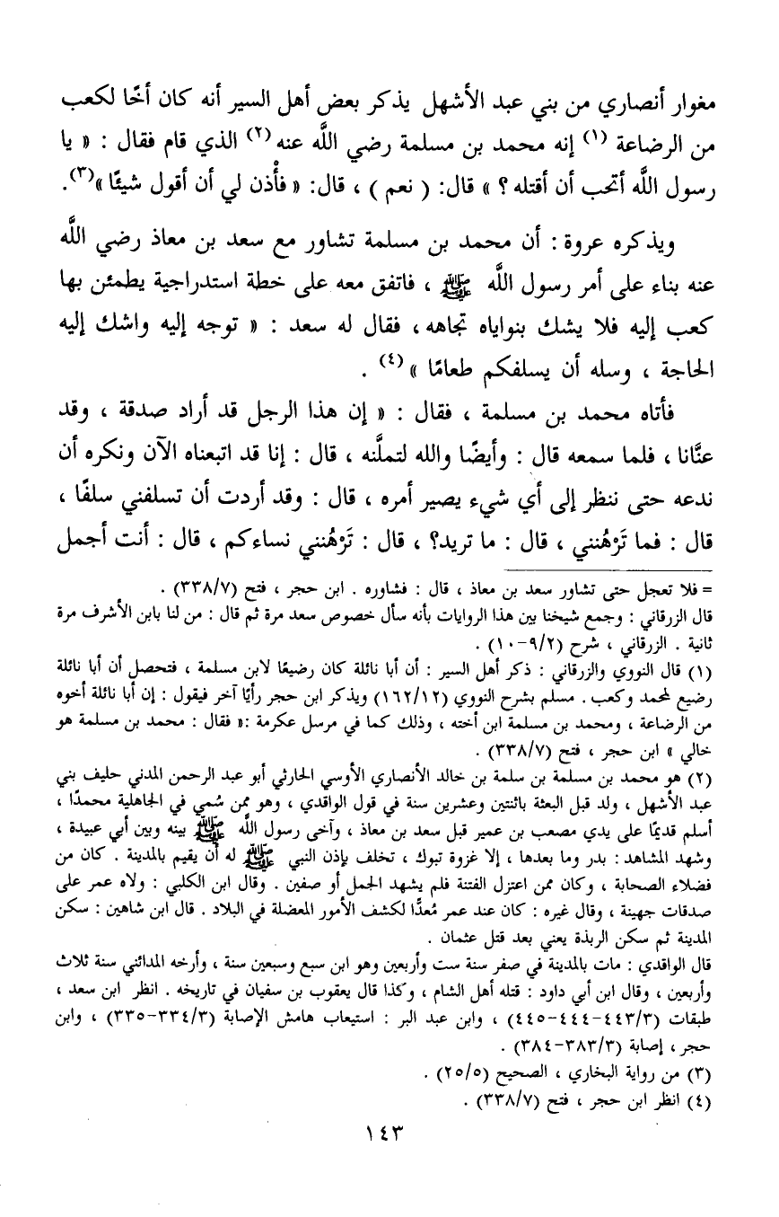 1 قال النووي والزرقاني: ذكر أهل السير: أن أبا نائلة كان رضيعا لابن مسلمة، فتحصل أن أبا نائلة رضيع لمحمد وكعب. مسلم بشرح النووي (12/162) ويذكر ابن حجر رأيا آخر فيقول: إن أبا نائلة أخوه من الرضاعة، ومحمد بن مسلمة ابن أخته، وذلك كما في مرسل عكرمة: "فقال: محمد بن مسلمة هو خالي" ابن حجر، فتح (7/338) .
