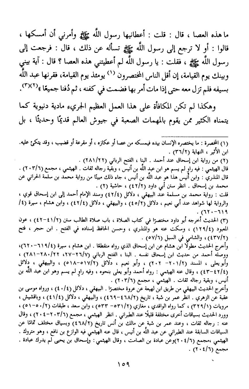 ما هذه العصا، قال: قلت: أعطانيها رسول الله صلى الله عليه وسلم وأمرني أن أمسكها، قالوا: أولا ترجع إلى رسول الله صلى الله عليه وسلم تسأله عن ذلك، قال: فرجعت إلى رسول الله صلى الله عليه وسلم، فقلت: يا رسول الله لم أعطيتني هذه العصا؟ قال: آية بيني وبينك يوم القيامة، إن أقل الناس المختصرون1 يومئذ يوم القيامة، فقرنها عبد الله بسيفه فلم تزل معه حتى إذا مات بها فضمت في كفنه، ثم دُفنا جميعا" 23.