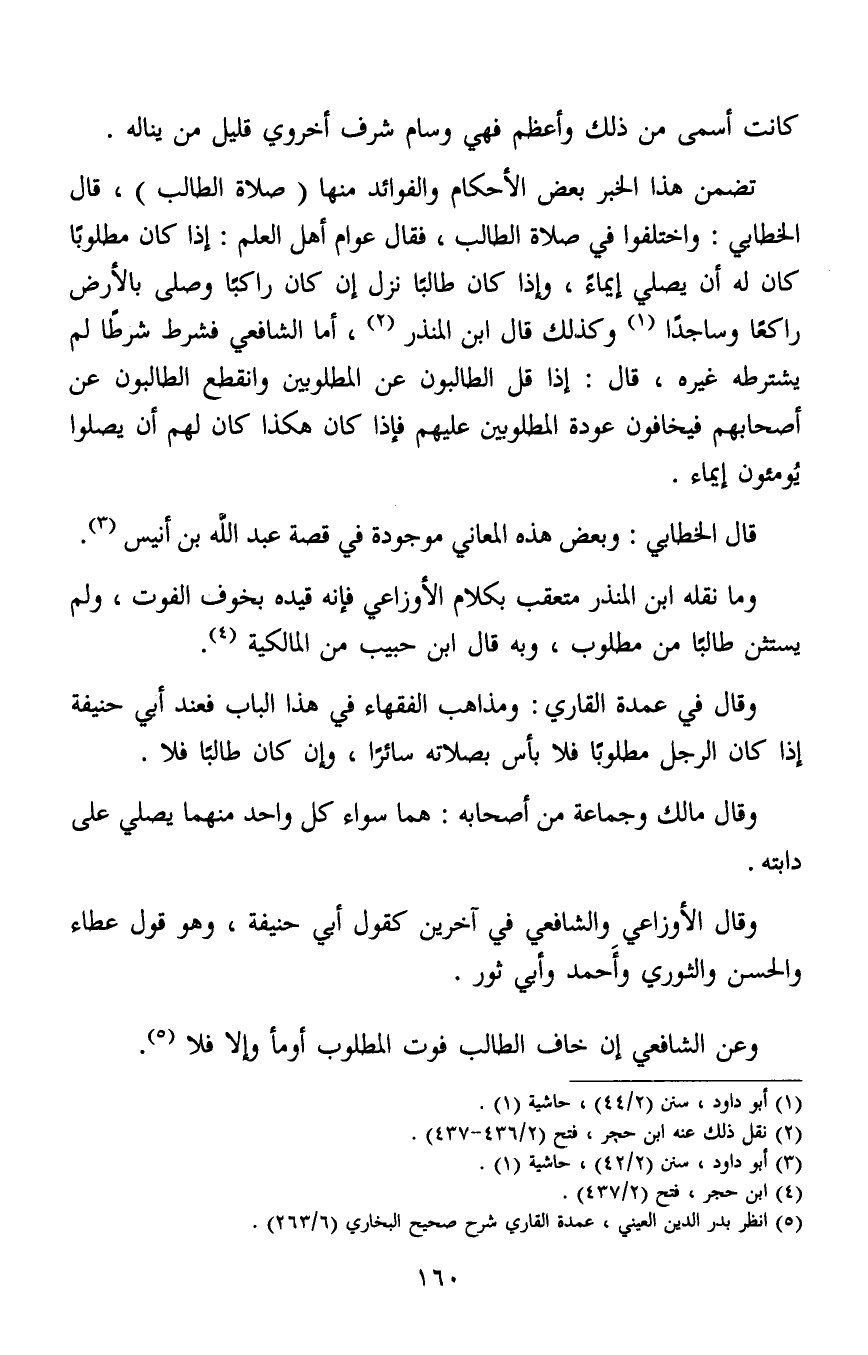 وقال في عمدة القاري: ومذاهب الفقهاء في هذا الباب فعند أبي حنيفة إذا كان الرجل مطلوبا فلا بأس بصلاته سائرا، وإن كان طالبا فلا.