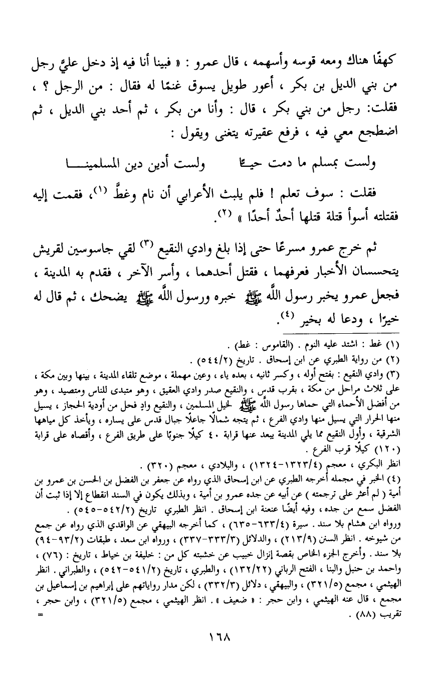 4 الخبر في مجمله أخرجه الطبري عن ابن إسحاق الذي رواه عم جعفر بن الفضل بن الحسن بن عمرو بن أمية (لم أعثر على ترجمته) عن أبيه عن جده عمرو بن أمية، وبذلك يكون في السند انقطاع إلا إذا ثبت أن الفضل سمع من جده، وفيه أيضا عنعنة ابن إسحاق. انظر الطبري تاريخ (2/542-545) .