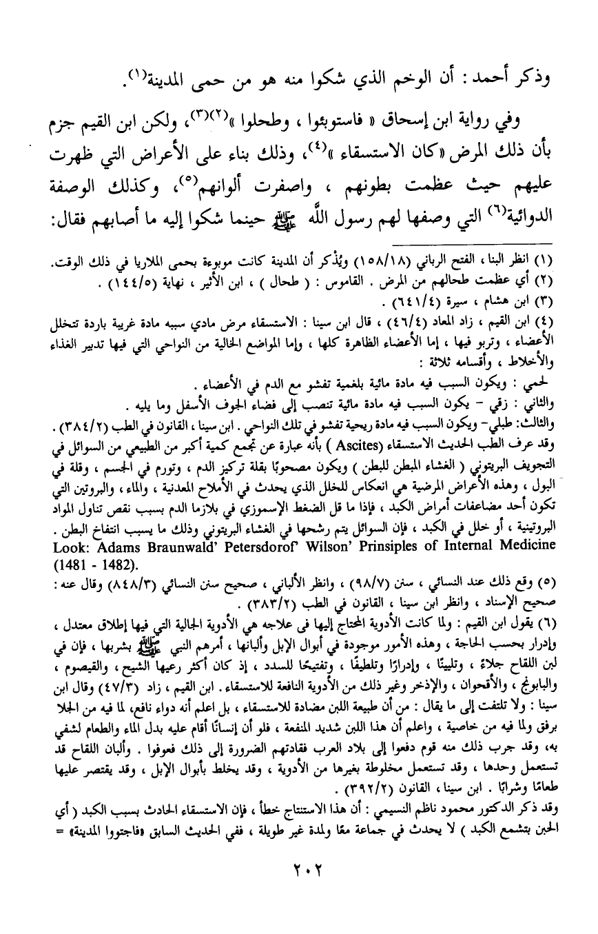 4 ابن القيم، زاد المعاد (4/46) ، قال ابن سينا: الاستسقاء مرض مادي سببه مادة غريبة باردة تتخلل الأعضاء، وتربو فيها، إما الأعضاء الظاهرة كلها، وإما الموضع الخالية من النواحي التي فيها تدبير الغذاء والأخلاط، وأقسامه ثلاثة: