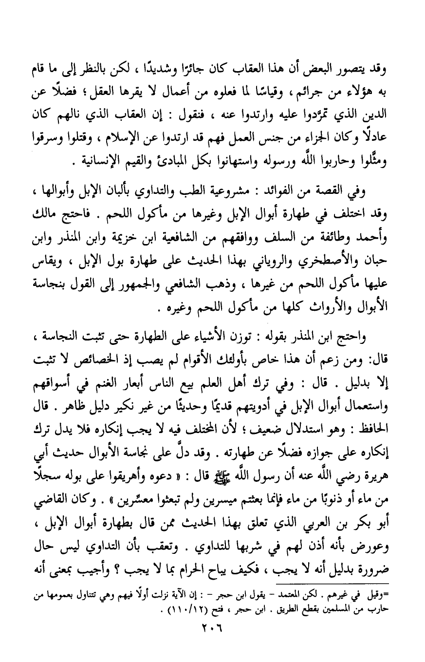 واحتج ابن المنذر بقوله: توزن الأشياء على طهارة حتى تثبت النجاسة، قال: ومن زعم أن هذا خاص بأولئك الأقوام لم يصب إذ الخصائص لا تثبت إلا بدليل. قال: وفي ترك أهل العلم بيع الناس أبعار الغنم في أسواقهم واستعمال أبوال الإبل في أدويتهم قديما وحديثا من غير نكير دليل ظاهر. قال الحافظ: وهو استدلال ضعيف، لأن المختلف فيه لا يجب إنكاره فلا يدل ترك إنكاره على جوازه فضلا عن طهارته. وقد دلَّ على نجاسة الأبوال حديث أبي هريرة رضي الله عنه أن رسول الله صلى الله عليه وسلم قال: "دعوه وأهريقوا على بوله سجلا من ماء أو ذنوبا من ماء فإنما بعثتم ميسرين ولم تبعثوا معسِّرين". وكان القاضي أبو بكر بن العربي الذي تعلق بهذا الحديث ممن قال بطهارة أبوال الإبل، وعورض بأنه أذن لهم في شربها للتداوي.وتعقب بأن التداوي ليس حال ضرورة بدليل أنه لا يجب،فكيف يباح الحرام بما لا يجب؟ وأجيب بمعنى أنه