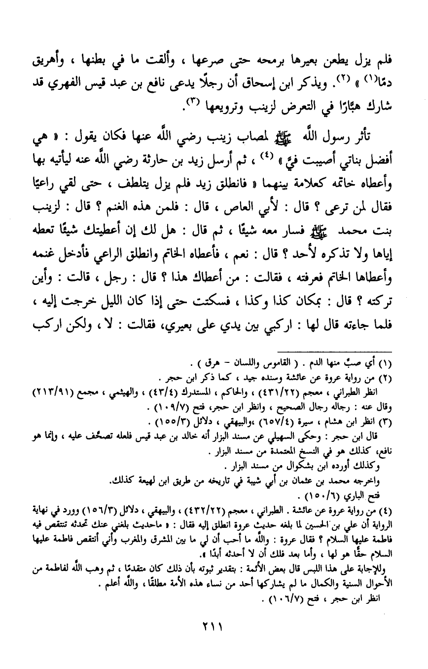 فلم يزل يطعن بعيرها برمحه حتى صرعها، وألقت ما في بطنها، وأهريق دمًا1"2. ويذكر ابن إسحاق أن رجلا يدعى نافع بن عبد قيس الفهري قد شارك هبّارا في التعرض لزينب وترويعها3.