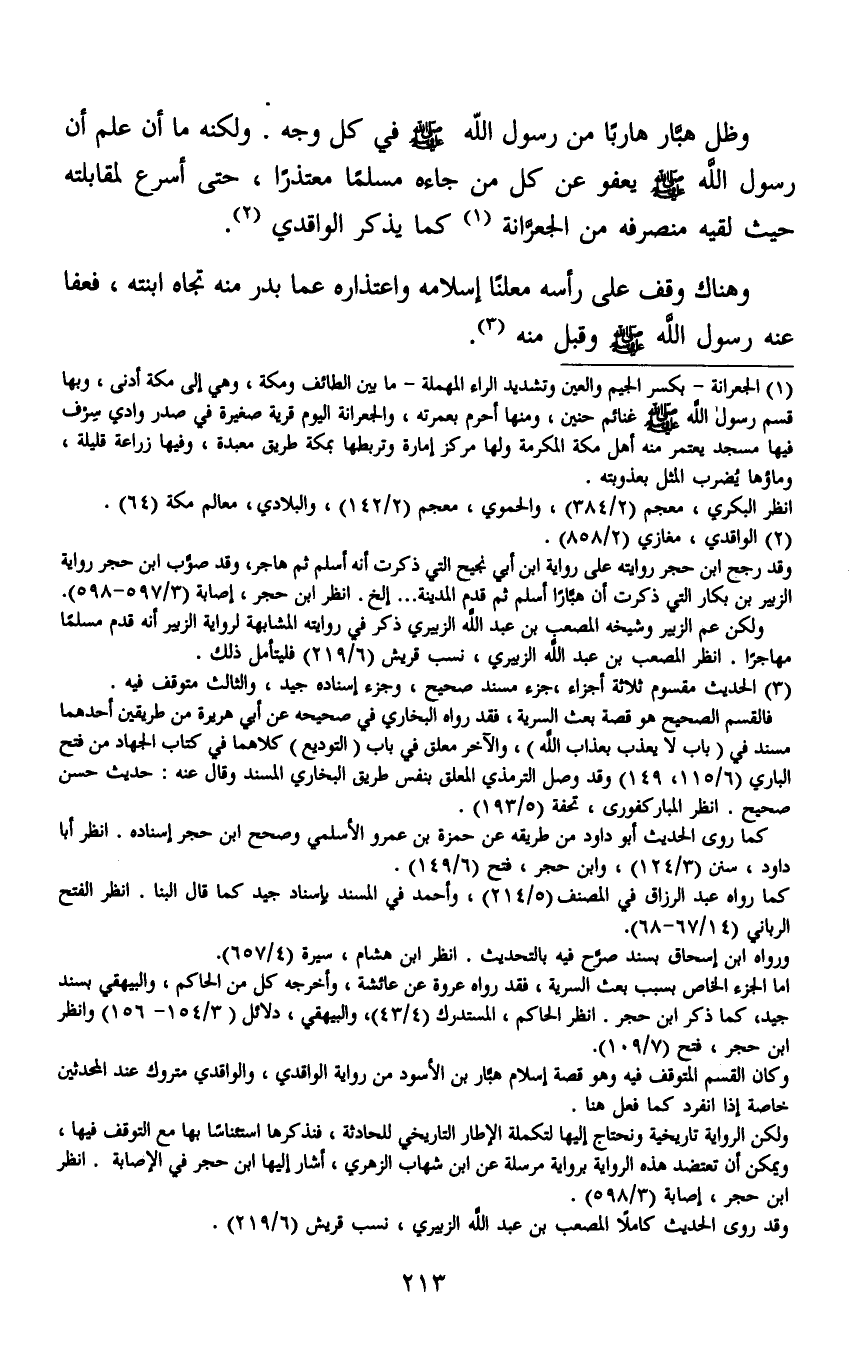وقد رجح ابن حجر روايته على رواية ابن أبي نجيح التي ذكر أنه أسلم ثم هاجر، وقد صوَّب ابن حجر رواية الزبير بن بكار التي ذكرت أن هبَّارا أسلم ثم قدم المدينة ... إلخ. انظر ابن حجر، إصابة (3/597-598) .