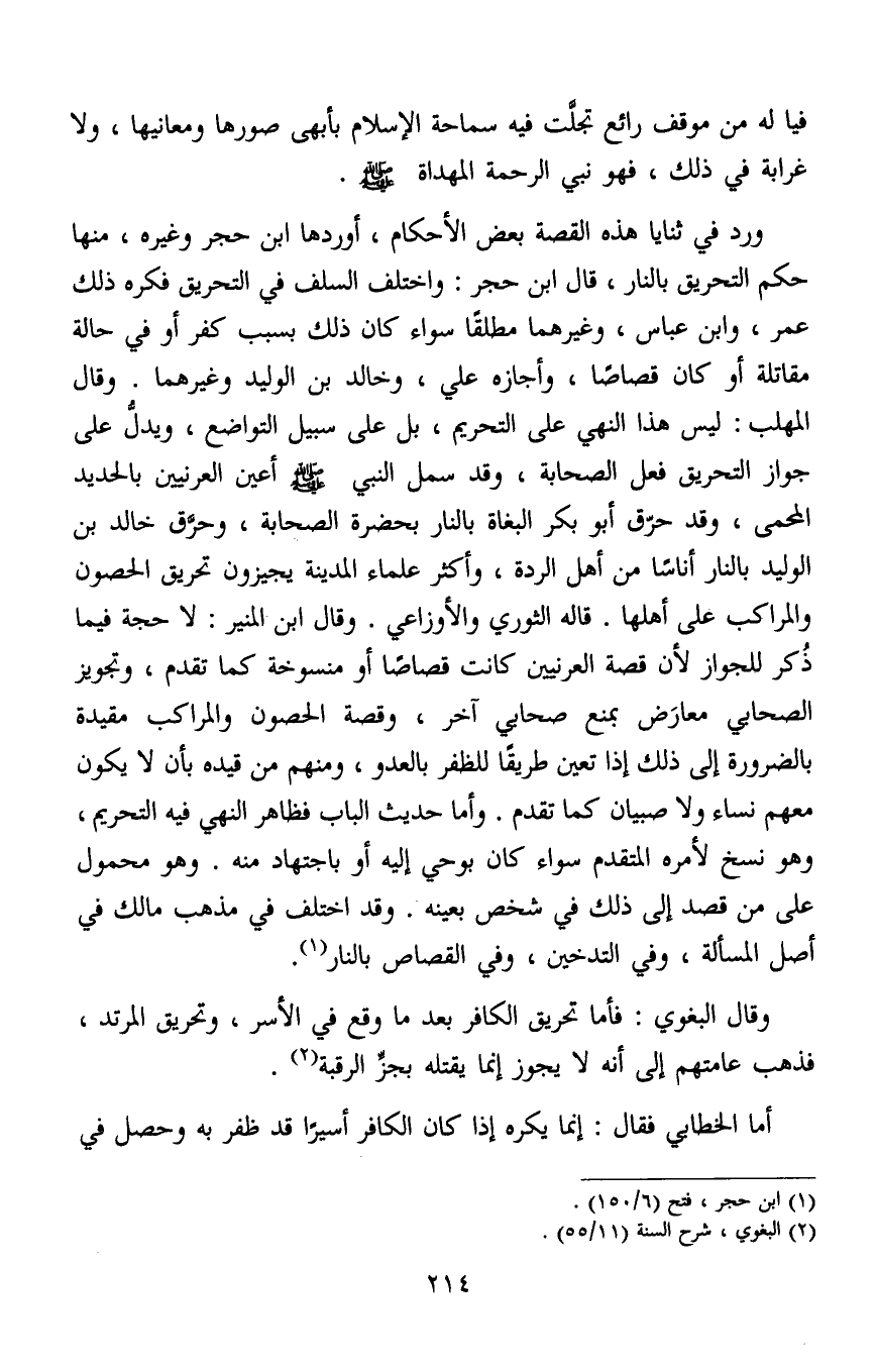 وقال البغوي: فأما تحريق الكافر بعد ما وقع في الأسر، وتحريق المرتد، فذهب عامتهم إلى أنه لا يجوز إنما يقتله بجزِّ الرقبة2.