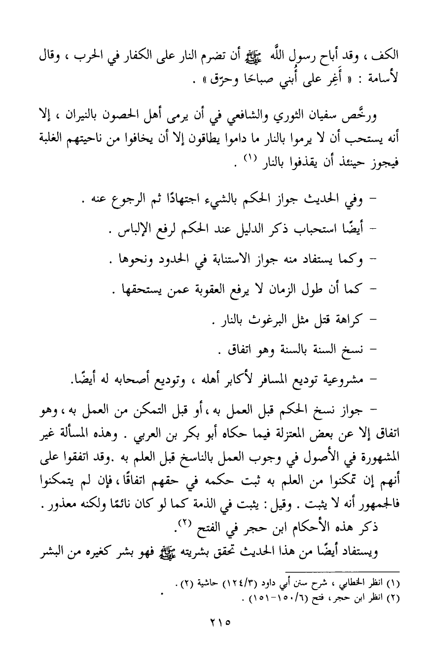 الكف، وقد أباح رسول الله صلى الله عليه وسلم أن تضرم النار على الكفار في الحرب، وقال لأسامة: "أَغِر على أُبني صباحا وحرّق".