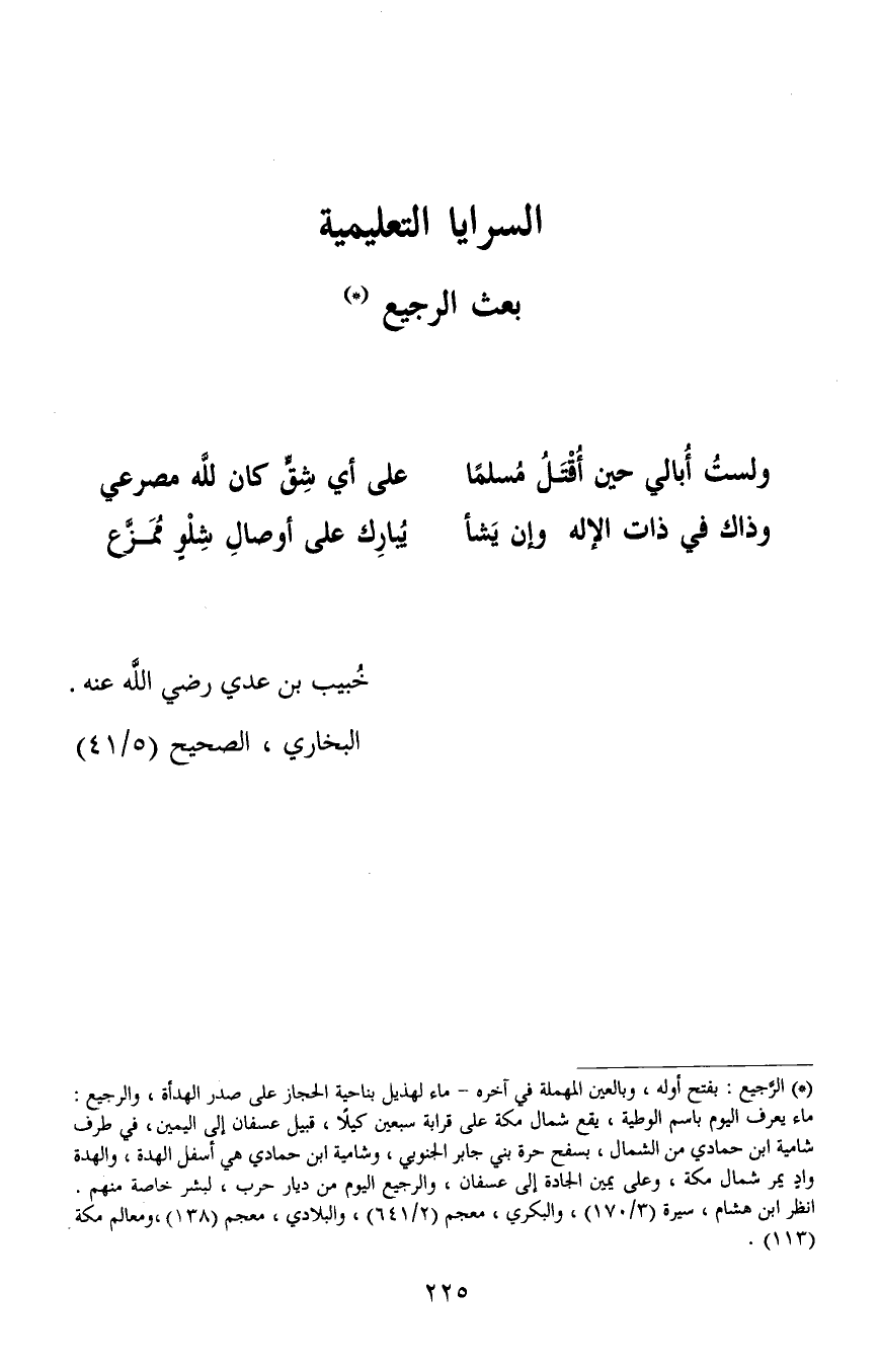 1 الرَّجيع: بفتح أوله، وبالعين المهملة في آخره –ماء لهذيل بناحية الحجاز على صدر الهدأة، والرجيع: ماء يعرف اليوم باسم الوطية، يقع شمال مكة على قرابة سبعين كيلا، قبيل عسفان إلى اليمن، في طرف شامية ابن حمادي من الشمال، بسفح حرة بني جابر الجنوبي، وشامية ابن حمادي هي أسفل الهدة، والهدة وادٍ يمر شمال مكة، وعلى يمين الجادة إلى عسفان، والرجيع اليوم من ديار حرب، لبشر خاصة منهم.