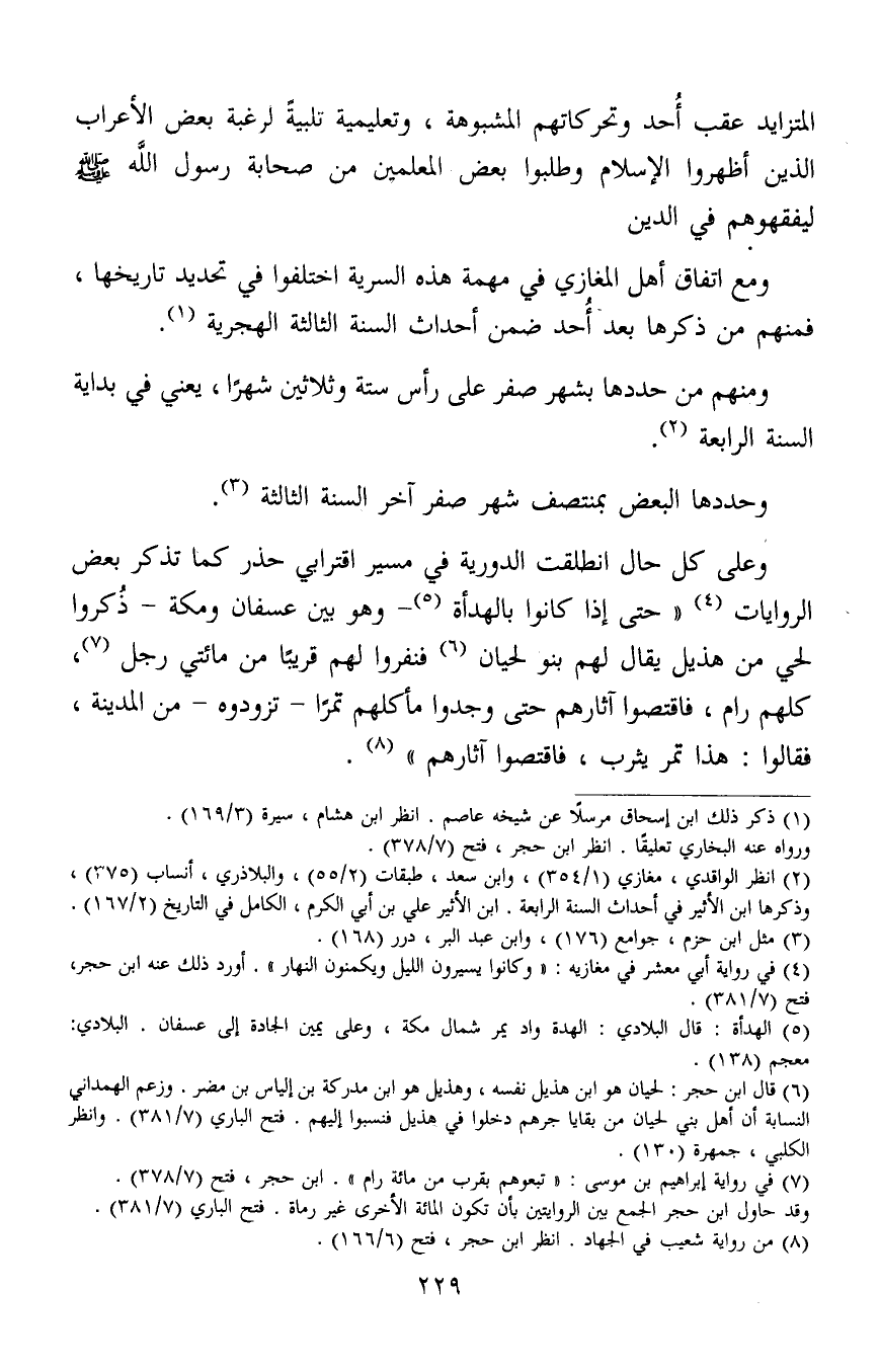 وعلى كل حال انطلقت الدورية في مسير اقترابي حذر كما تذكر بعض الروايات4 "حتى إذا كانوا بالهدأة5- وهو بين عسفان ومكة- ذُكروا لحي من هذيل يقال لهم بنو لحيان6 فنفروا لهم قريبا من مائتي رجل7، كلهم رام، فاقتصوا آثارهم حتى وجدوا مأكلهم تمرًا –تزودوه- من المدينة، فقالوا: هذا تمر يثرب، فاقتصوا آثارهم8.