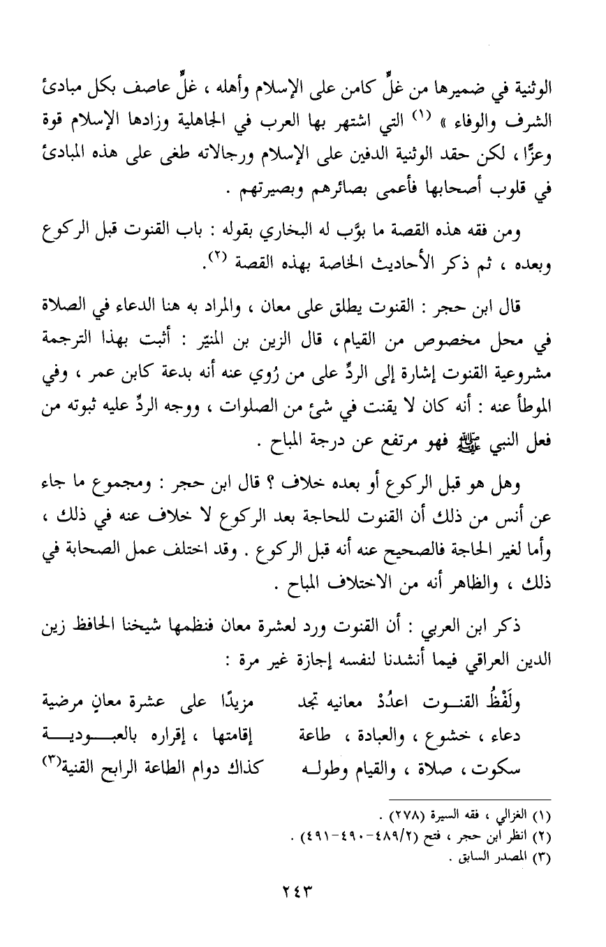ذكر ابن العربي: أن القنوت ورد لعشرة معان فنظمها شيخنا الحافظ زين الدين العراقي فيما أنشدنا لنفسه إجازة غير مرة: