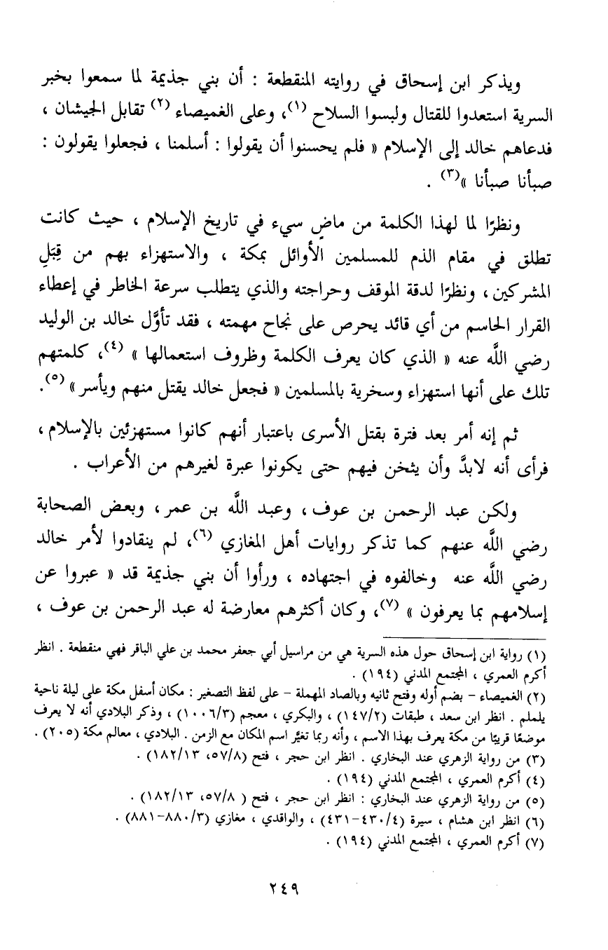 ولكن عبد الرحمن بن عوف، وعبد الله بن عمر، وبعض الصحابة رضي الله عنهم كما تذكر روايات أهل المغازي6، لم ينقادوا لأمر خالد رضي الله عنه وخالفوه في اجتهاده، ورأوا أن بني جذيمة قد "عبروا عن إسلامهم بما يعرفون"7، وكان أكثرهم معارضة له عبد الرحمن بن عوف،